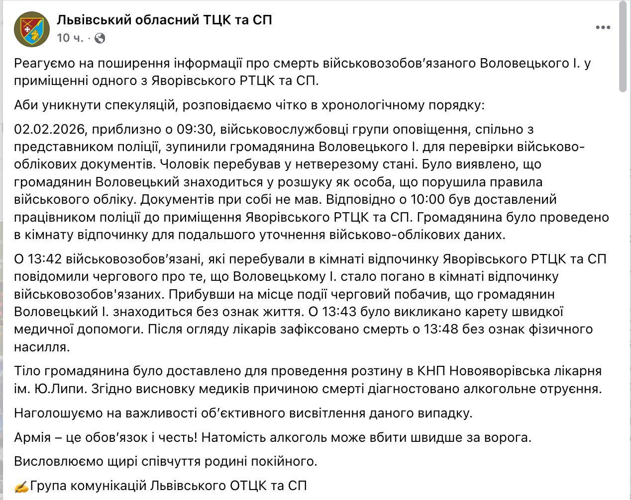 По информации Львовского областного ТЦК, мужчина на момент задержания был пьян и не имел обновлённых военных документов. Его отвезли в «комнату отдыха» к другим мобилизованным. Через некоторое время они сообщили дежурному, что мужчине стало плохо. Врачи зафиксировали смерть через 5 минут после первого обращения.