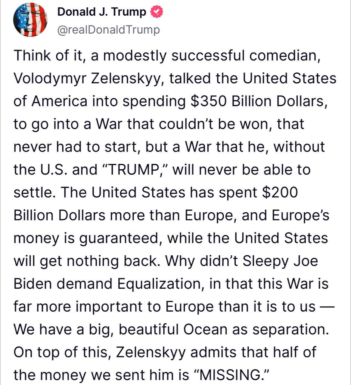 «Подумайте только: имевший скромный успех комик Владимир Зеленский убедил Соединенные Штаты Америки потратить 350 миллиардов долларов на войну, которую нельзя было выиграть, которая никогда не должна была начаться, но которую он без США и Трампа никогда не сможет урегулировать.