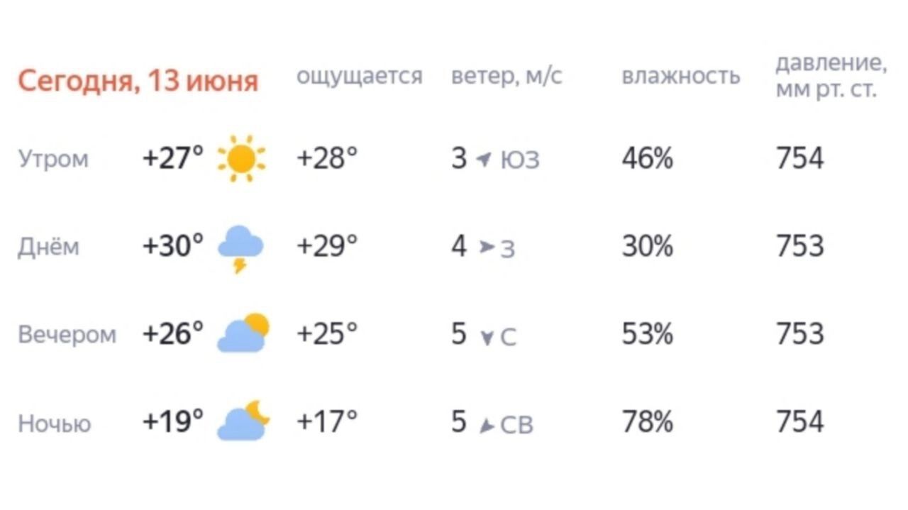 В Сургуте утром обещают малую облачность, а в обед — грозу: она закончится к вечеру, но пасмурно будет — уже до конца дня. Утром температура составит до +27 градусов, днем — до +30 градусов. Вечером немного похолодает — до +26 градусов, ночью — +19 градусов. Ветер — юго-западный с переходом в западный, северный и северо-восточный, 3-5 м/с.