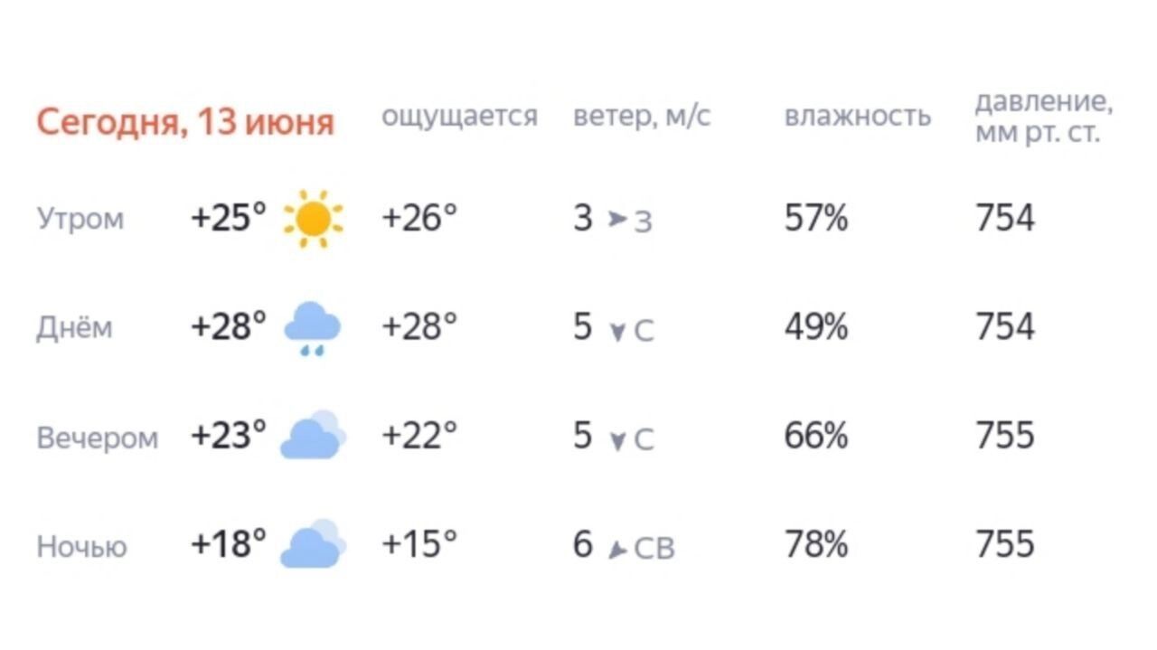 В Ханты-Мансийске утром будет солнечно, но уже к обеду — пойдет дождь. Вечером осадки прекратятся, однако тучи — уже не разойдутся до конца дня. В утренние часы прогнозируют +25 градусов, днем — +28 градусов. Вечером похолодает до +23 градусов, ночью — до +18 градусов. Ветер — западный с переходом в северный и северо-восточный, 3-6 м/с.
