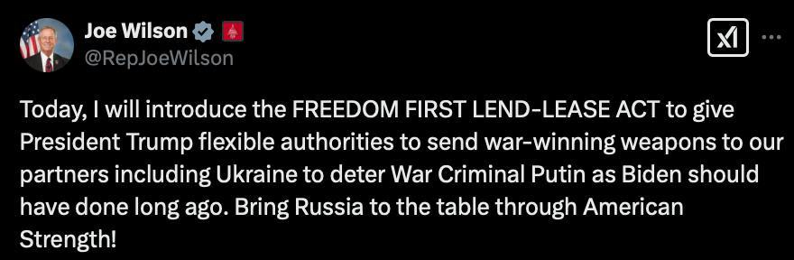 В США сегодня представят «закон о ленд-лизе», который позволит Трампу отправить Украине «победоносное оружие», — конгрессмен-республиканец Джо Уилсон