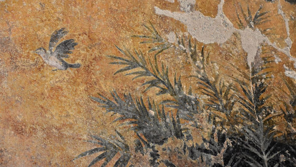Под толстым слоем известнякового налета скрывалась значительная часть декора, выполненного в одном из модных римских стилей. На стенах чередуются цветные участки. Над небольшой чашей бассейна, окрашенной в бирюзовый цвет, располагалась роспись: растения и птицы на желтом фоне, — и она пережила второе открытие благодаря современным лазерным технологиям. Также растительным декором была украшена одна из колонн.