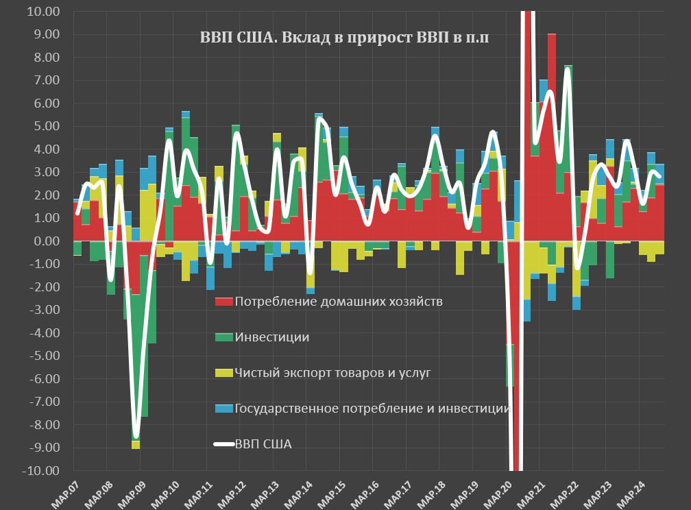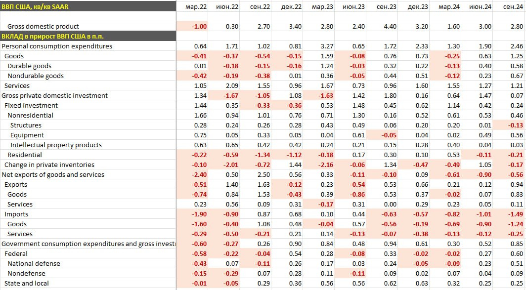 Экономика США выросла на 2.8% кв/кв SAAR (в годовом выражении с устранением сезонного эффекта), за 9м24 – 2.5% vs 3.2% за 9м23, 2.3% с начала 2022 по сравнению со среднесрочным темпом (2017-2019) на уровне 2.84% и долгосрочным темпом (2011-2019) на уровне 2.4%.