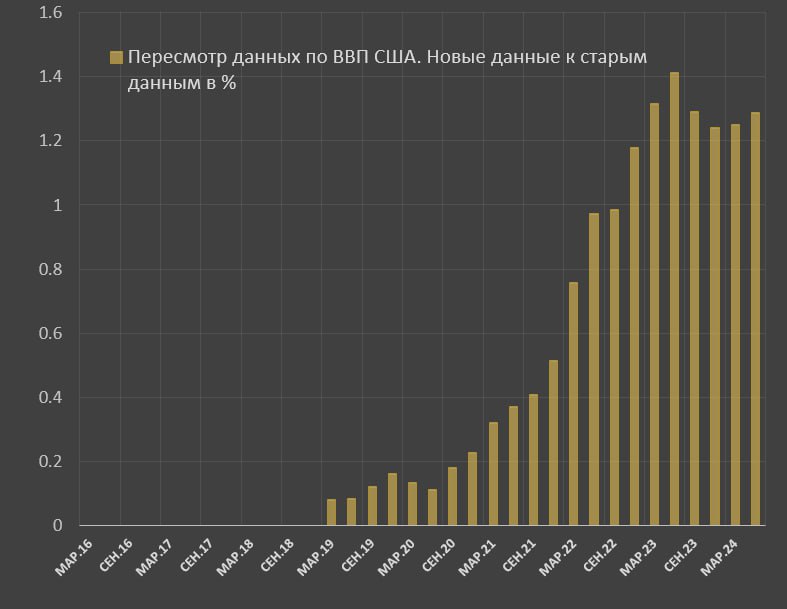 В 2019-2020 пересмотр данных был в рамках статистической погрешности буквально на сотые доли процента, а основной массив пересмотренных данных пришелся на «Байденомику», как раз с начала 2021, где данные улучшились на внушительные почти 0.1% квартального прироста, а с накопленным итогом это приводит к разлету почти в 1.4% экономики.
