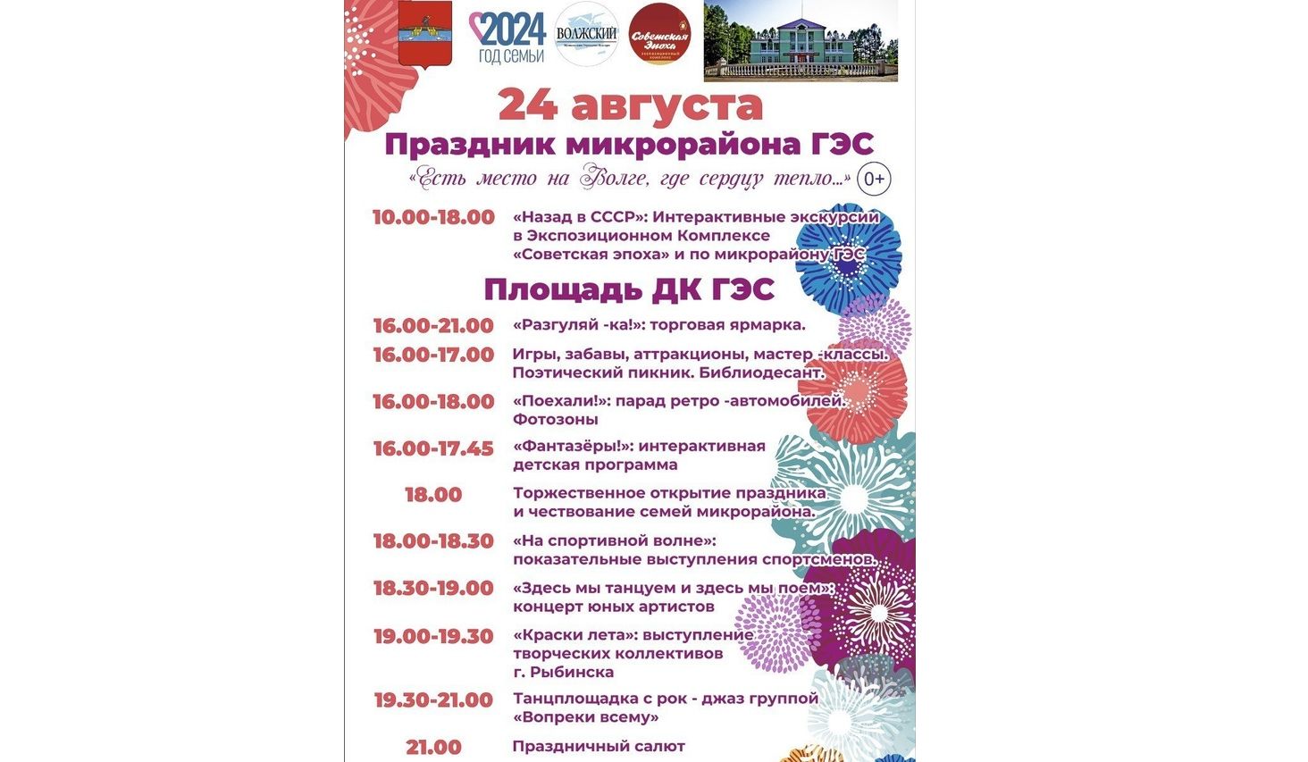 В эти выходные, 24 августа, в Рыбинске отметят День поселка ГЭС. В программе интерактивные детские игры, показательные выступления спортсменов, творческие номера и торговая ярмарка.