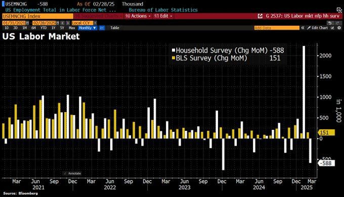 Рынок труда США находится в состоянии готовности к рецессии. Опрос предприятий показал создание 151 000 новых рабочих мест в феврале, что меньше ожидаемого. Согласно опросу домохозяйств, сокращено в этом месяце было 588 000 рабочих мест.