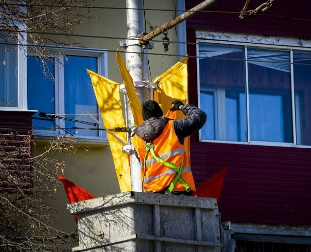 Над Комсомольским проспектом уже крепят перетяжки «Атрибуты Победы», а над Коммунальным мостом и на участке от улиц Попова до Петропавловской —«Журавли». Две стелы «Слава Победы» установят внутри круговых развязок на Колхозной площади у Центрального рынка и у ТРЦ «Планета». Высота конструкций составит 11 м.