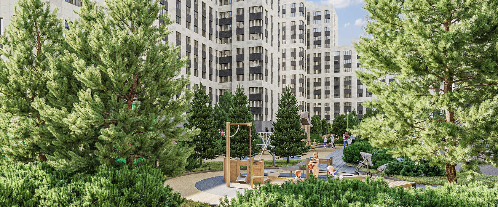 Для маленьких жителей будет предусмотрена игровая территория, выполненная в общей природной стилистике ландшафта. Для наполнения детских площадок использовалось оборудование в стиле «Эко», которое прекрасно сочетается с неброскими оттенками фасадов. Эта зона будет разделена на две части: одна — для безопасных игр малышей, вторая — для разных активностей подростков. Центром притяжения для детворы станет деревянный «Самолет» необычной формы на круглой площадке двора.