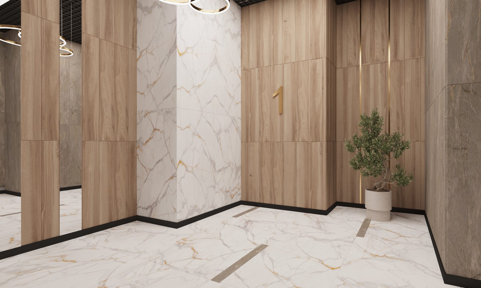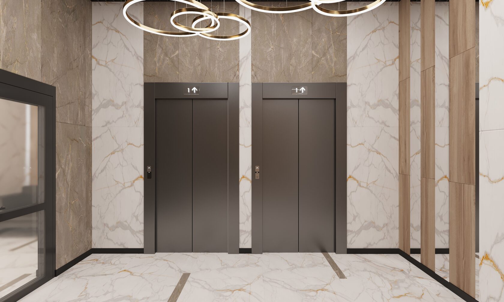 Интерьер парадных. Теплые бежево-песочные тона с добавлением золотых акцентов будут создавать солнечное настроение даже в пасмурную погоду. А большие встроенные зеркала расширят пространство и наполнят его светом. В холле спроектирована лаундж-зона с просторным диваном для отдыха. В доме будут лифты немецкого бренда Steimberg с дизайнерским оформлением кабин, поддерживающим общую стилистику проекта.