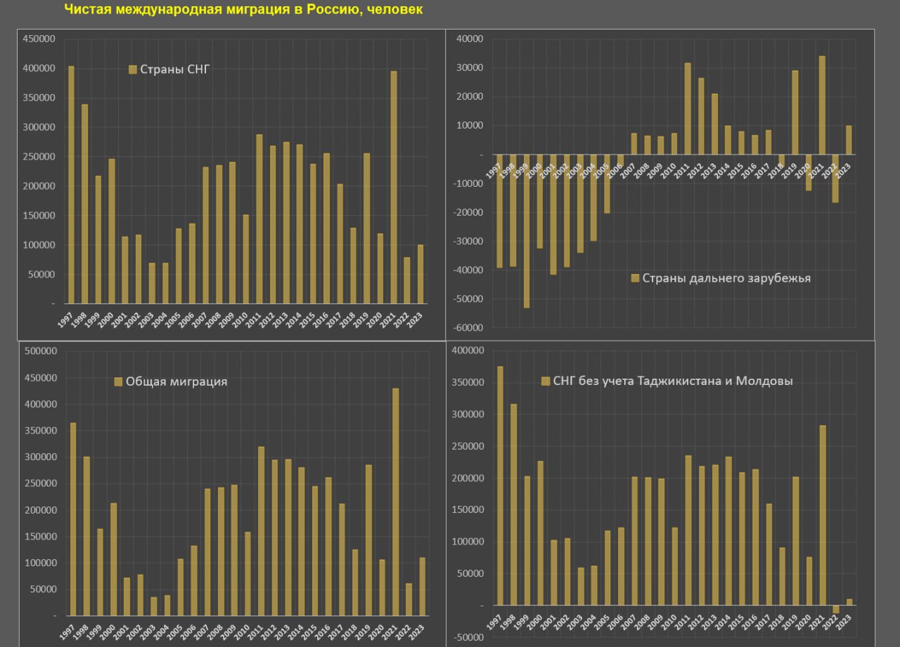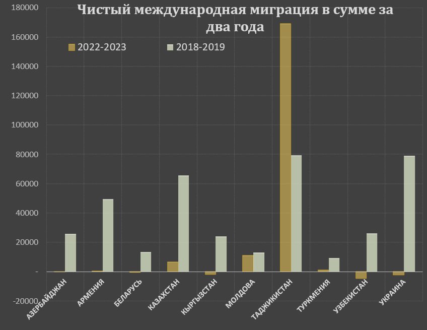 Как можно заметить на гистограмме, с 2022 чистый приток сохранился или вырос только из Молдовы и Таджикистана.