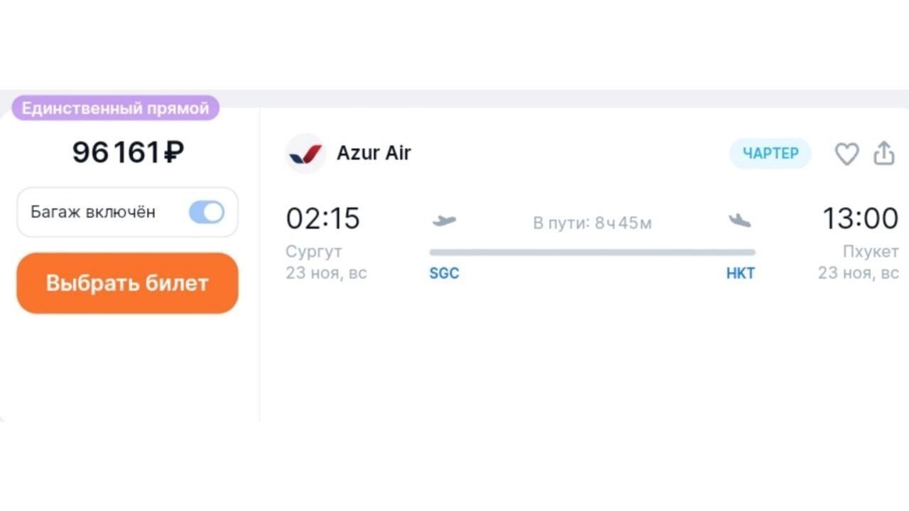 Авиакомпания Azur Air запустит прямые перелет из Сургута на популярный курорт Таиланда — Пхукет. Первый рейс запланировали 23 ноября.