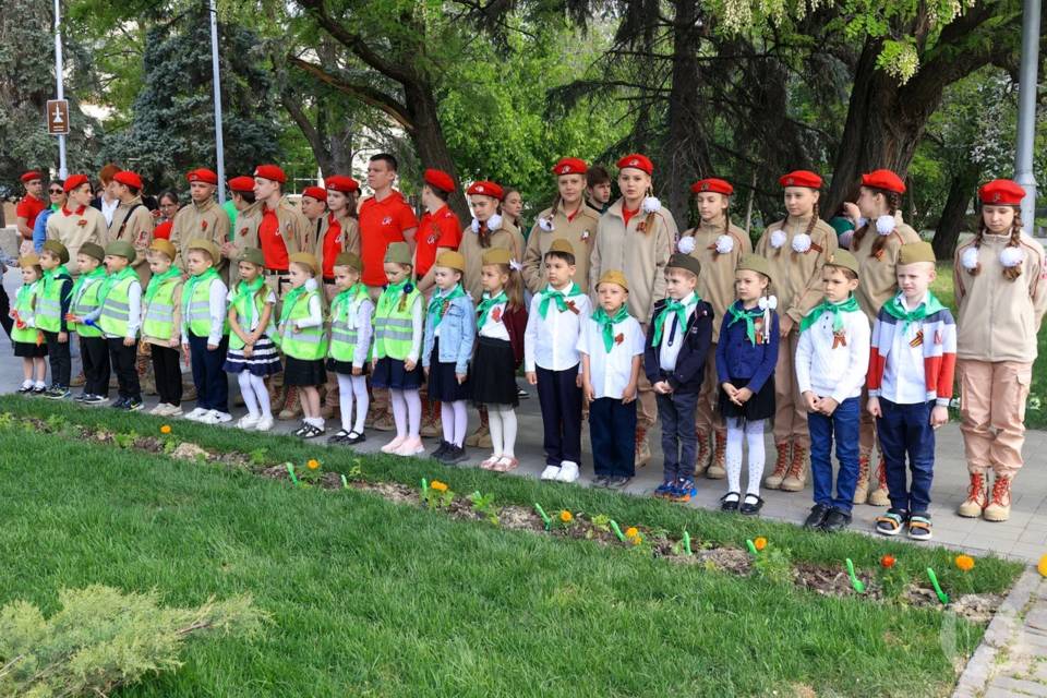 В преддверии юбилея Великой Победы 80 бархатцев ярко-оранжевого, желтого и красного оттенков кадеты, юнармейцы, воспитанники детских садов, студенты, общественники, представители администрации Ворошиловского района и депутатского корпуса высадили на клумбе, расположенной в сквере имени Саши Филиппова, вблизи могилы молодого разведчика.