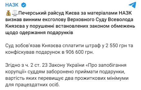 Экс-главу Верховного суда Князева оштрафовали на 2 550 грн за подарок стоимостью 906 тыс. грн, — НАПК