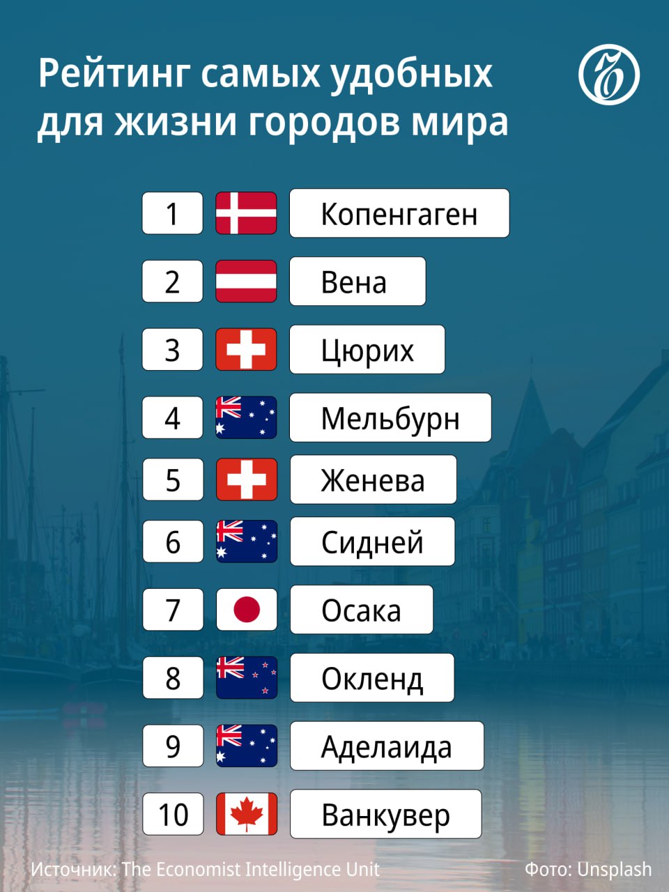 📍 Копенгаген стал самым удобным городом для жизни в 2025 году по итогам ежегодного рейтинга Economist Intelligence Unit (EIU). Столице Дании удалось получить 100 баллов за стабильность, а также за качество здравоохранения и инфраструктуры.