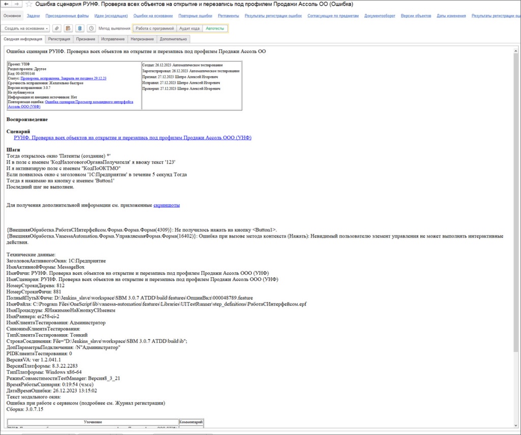 Расследование ошибок может занимать и 5-10 минут, а может и полдня. С нашими программами работают предприниматели из разных сфер (продажи, услуги, производство и др.) и сценарии, которые они используют, тоже могут сильно друг от друга отличаться. Кто-то с помощью "1С: УНФ" печет и продает хлеб, а кто-то изготавливает мебель. Иногда к ошибкам приводит наличие определенных данных, характерных только для данного вида бизнеса. И не сразу понятно, почему пекарни нормально пользуются нашим продуктом, а на производстве мебели появляется ошибка. Мы видим только часть кода с ошибкой, а потом выясняем, какие действия пользователей к ней привели.
