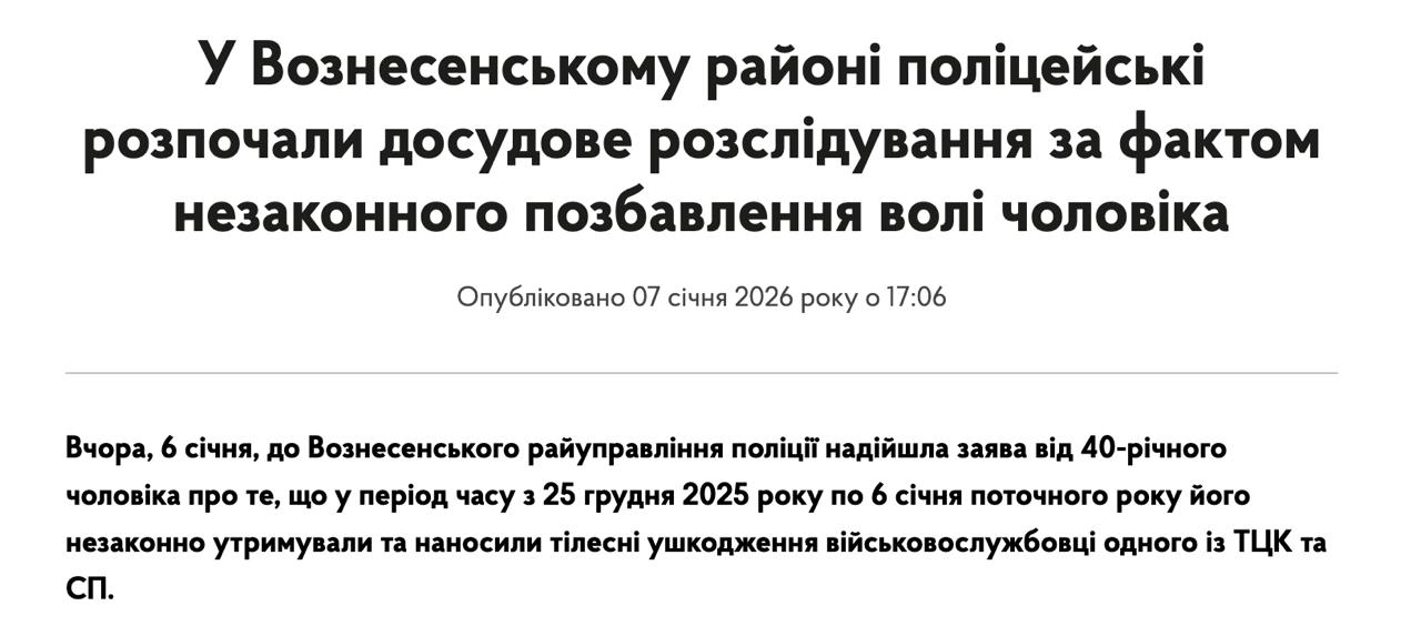 Николаевская полиция фактически признаёт очередной тяжёлый инцидент в системе ТЦК: начато расследование по факту незаконного удержания и избиения человека.