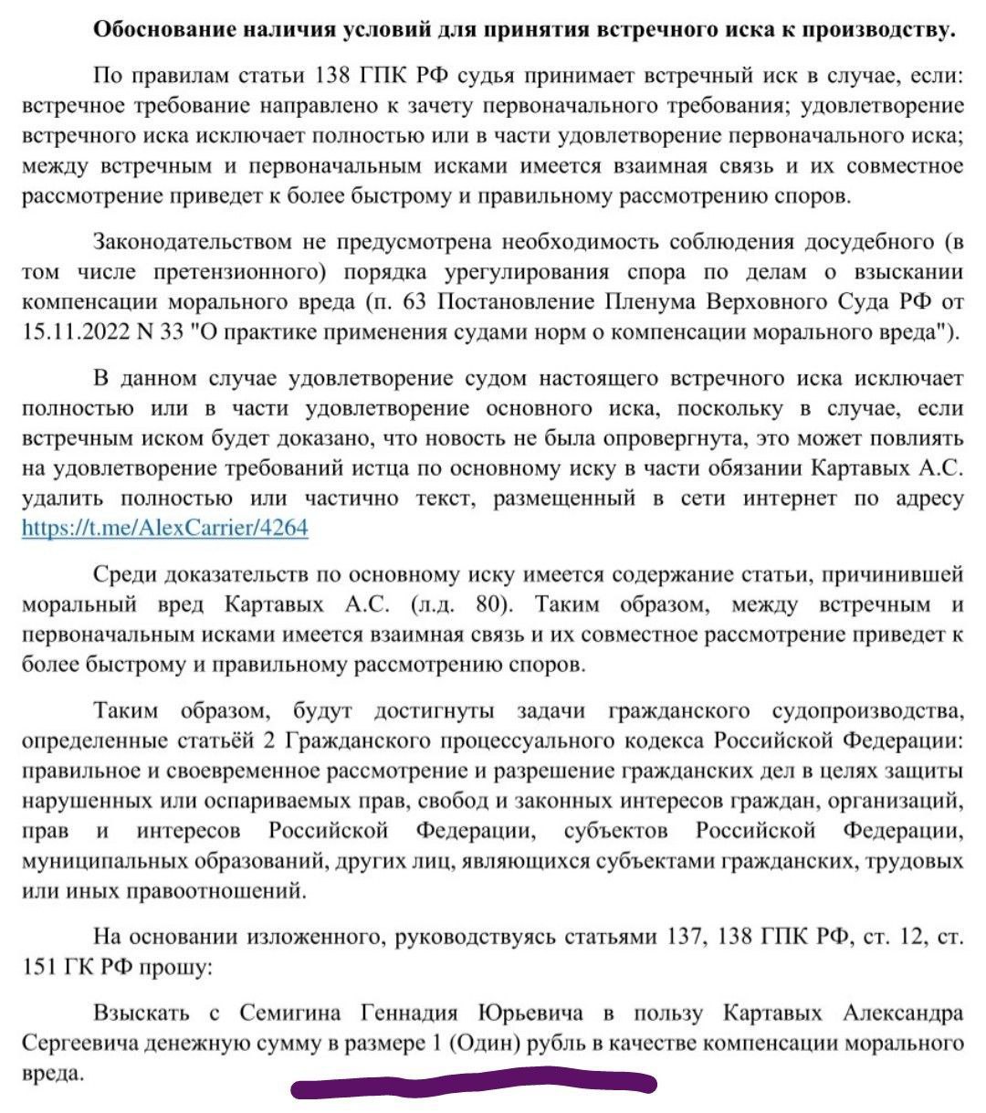Собственно, изначальный предмет спора это мои высказывания в адрес Семигина и его репутационные потери от них. Но причиной этих высказываний явилась публикация на сайте "Патриотов России". Отчего уже я испытал ужасные моральные страдания, читая ту самую мессагу про "гнать палками в бой". Потом было заявлено, что случился "взлом с пятницы на воскресенье", в результате которого неизвестные злодеи завладели сайтом "Патриотов", о чем в материалах иска на меня есть целых два экспертных заключения, плюс заведено уголовное дело. Но экспертные заключения совсем какието слабенькие, а уголовное дело так и "расследуется". Ну, тоесть такто я не обязан верить в то, что раз Семигин заявил, что его взломали, то так оно на самом деле и есть. Но в рамках текущего процесса это выяснить невозможно, я там сторона обороняющаяся. Поэтому мы выкатили иск к гражданину Семигину, где мы с ним меняется местами и уже его задачей будет доказывать, что он не верблюд.