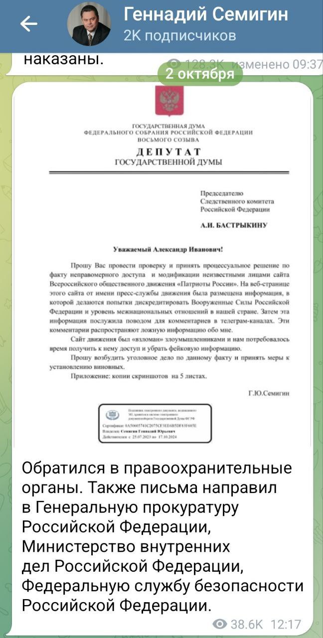 Заявление в СК было опубликовано самим Семигиным 02.10.2023 у него на канале. 29.11.2023 года (почти через два месяца) дело возбуждает СУ СУ УВД по ЦАО ГУ МВД РФ по Москве. А потерпевшим Семигина признают вообще 18.01.2024. И с тех пор, уже больше полугода, непонятно, кто "Патриотов" взломал и взломал ли вообще. Но это не мешает Семигину судиться с людьми и даже эти суды выигрывать. Какаято не очень понятная ерунда происходит.