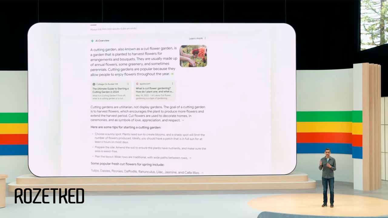 Сундар Пичай во время презентации анонсировал запуск в поиске Google функции AI Overview — это быстрый ответ на вопрос на основе ряда источников.