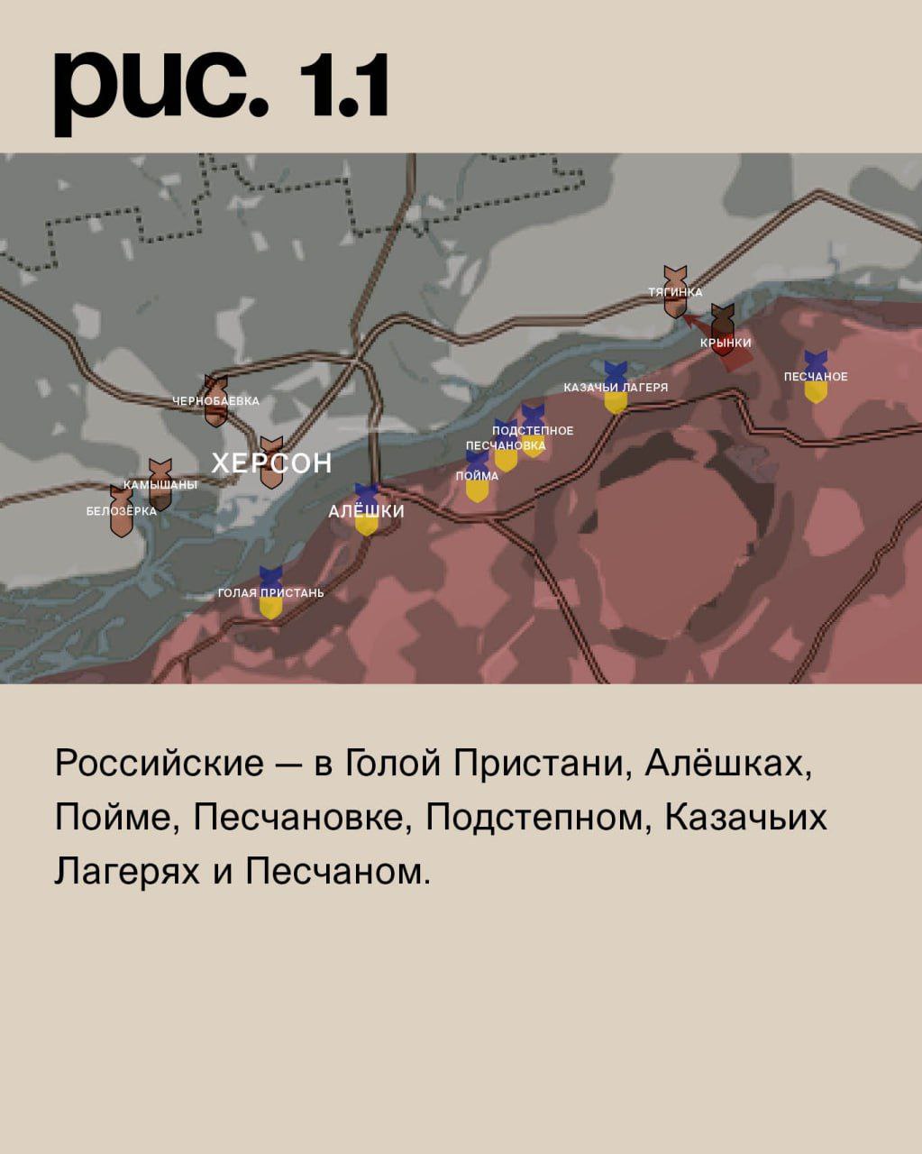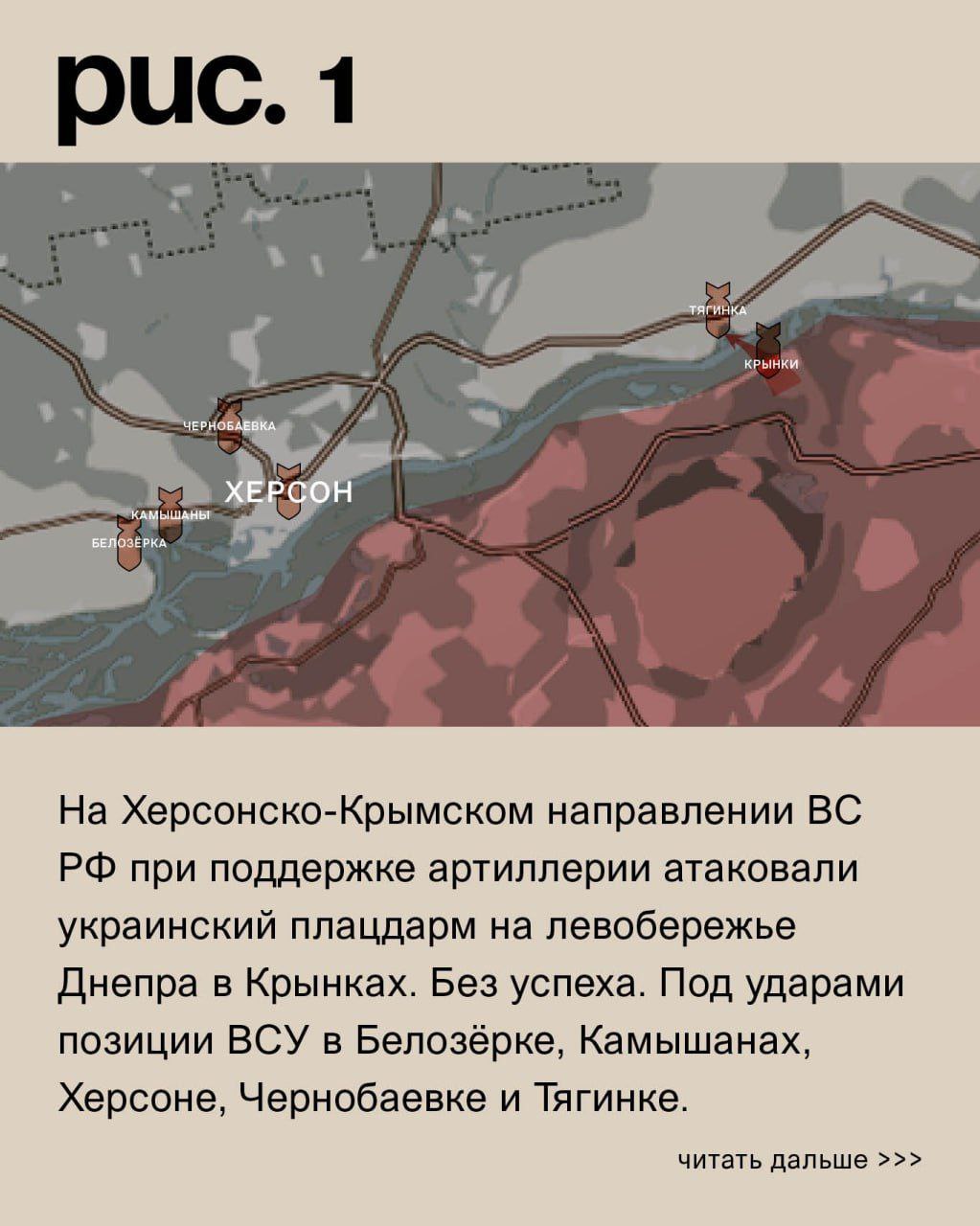 На Херсонско-Крымском направлении ВС РФ при поддержке артиллерии атаковали украинский плацдарм на левобережье Днепра в Крынках. Без успеха. Под ударами позиции ВСУ в Белозёрке, Камышанах, Херсоне, Чернобаевке и Тягинке. Российские – в Голой Пристани, Алёшках, Пойме, Песчановке, Подстепном, Казачьих Лагерях и Песчаном. (Рис. 1)