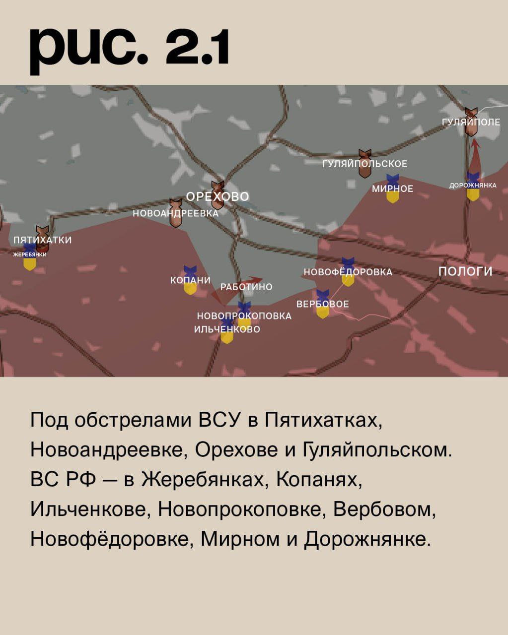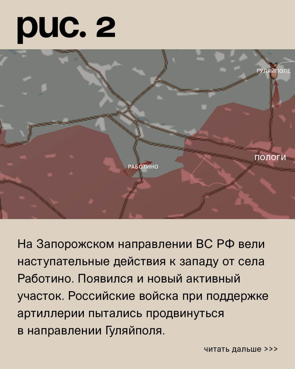 На Запорожском направлении ВС РФ вели наступательные действия к западу от села Работино. Появился и новый активный участок. Российские войска при поддержке артиллерии пытались продвинуться в направлении Гуляйполя. Под обстрелами ВСУ в Пятихатках, Новоандреевке, Орехове и Гуляйпольском. ВС РФ – в Жеребянках, Копанях, Ильченкове, Новопрокоповке, Вербовом, Новофёдоровке, Мирном и Дорожнянке. (Рис. 2)