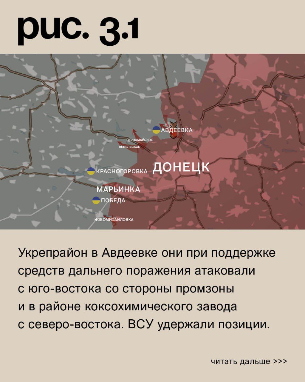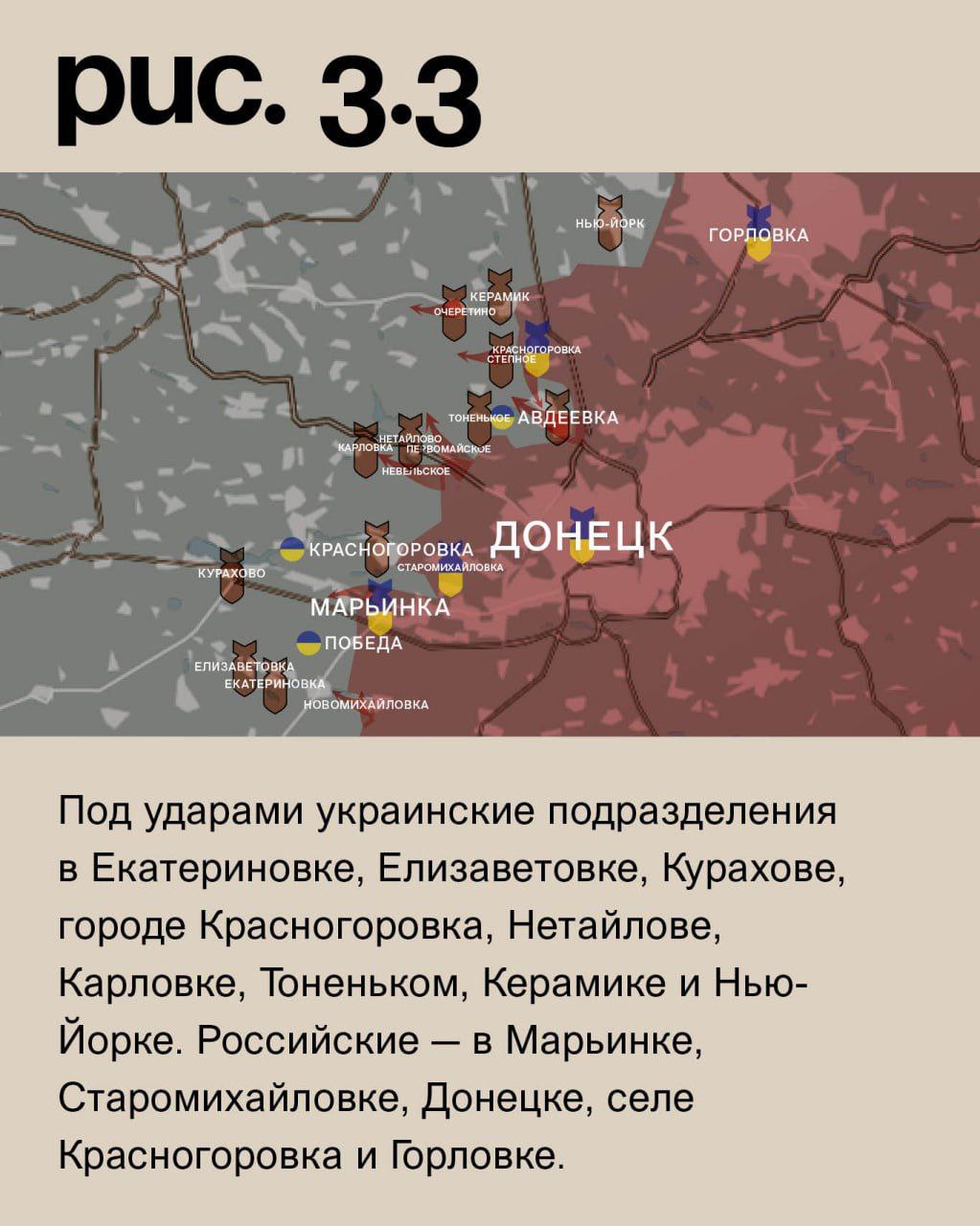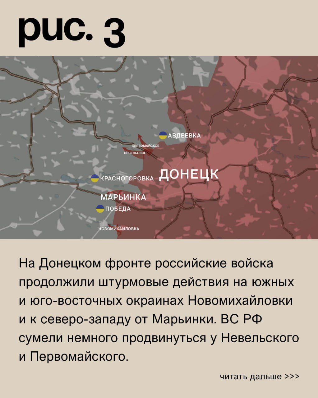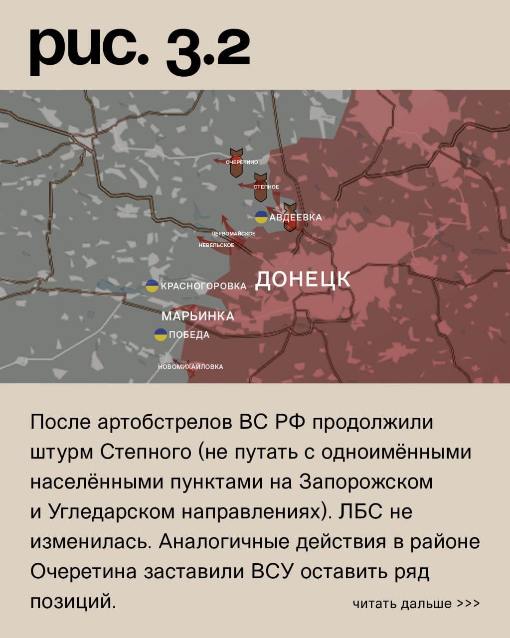 На Донецком фронте российские войска продолжили штурмовые действия на южных и юго-восточных окраинах Новомихайловки и к северо-западу от Марьинки. ВС РФ сумели немного продвинуться у Невельского и Первомайского. Укрепрайон в Авдеевке они при поддержке средств дальнего поражения атаковали с юго-востока со стороны промзоны и в районе коксохимического завода с северо-востока. ВСУ удержали позиции. После артобстрелов ВС РФ продолжили штурм Степного (не путать с одноимёнными населёнными пунктами на Запорожском и Угледарском направлениях). ЛБС не изменилась. Аналогичные действия в районе Очеретина заставили ВСУ оставить ряд позиций. Под ударами украинские подразделения в Екатериновке, Елизаветовке, Курахове, городе Красногоровка, Нетайлове, Карловке, Тоненьком, Керамике и Нью-Йорке. Российские – в Марьинке, Старомихайловке, Донецке, селе Красногоровка и Горловке. (Рис. 3)
