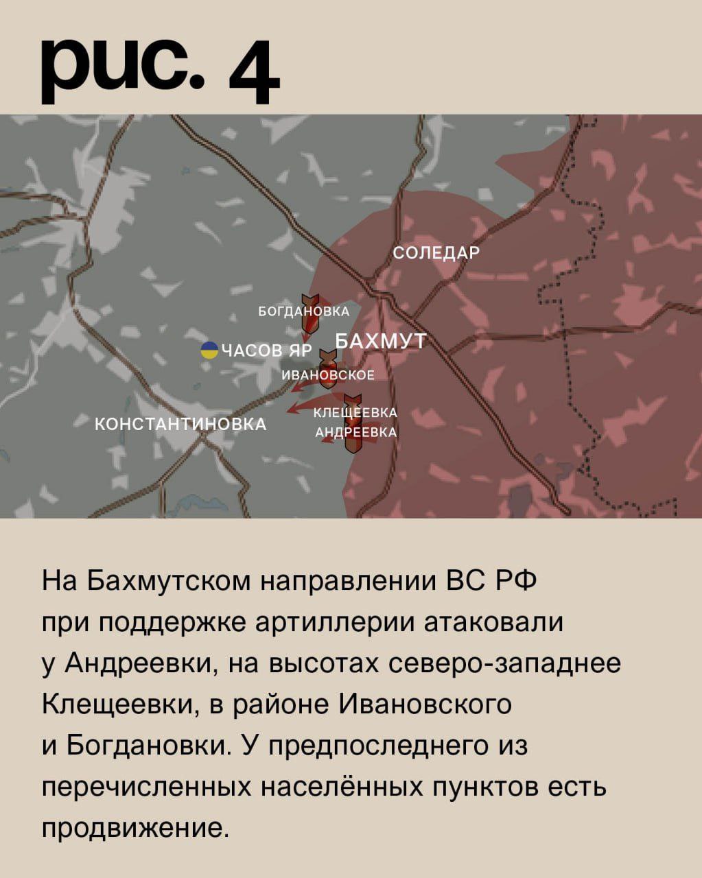 На Бахмутском направлении ВС РФ при поддержке артиллерии атаковали у Андреевки, на высотах северо-западнее Клещеевки, в районе Ивановского и Богдановки. У предпоследнего из перечисленных населённых пунктов есть продвижение. (Рис. 4)