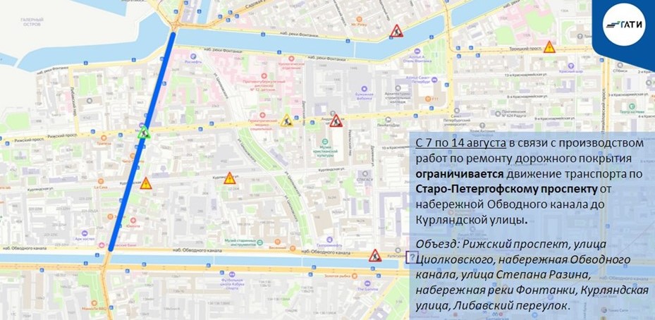 В Адмиралтейском районе из-за ремонта асфальта с 7 по 14 августа ограничат движение по Старо-Петергофскому проспекту от набережной Обводного канала до Курляндской улицы.