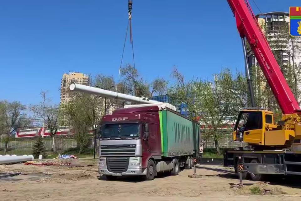 Части конструкции, выполненные из высокопрочной стали, мастера разгружают на площадку, используя спецтранспорт. Затем будет проводиться сборка опор. В мэрии "Городским вестям" уточнили, что объект создается в рамках соглашения, заключенного администрацией муниципального учреждения с инвестором.