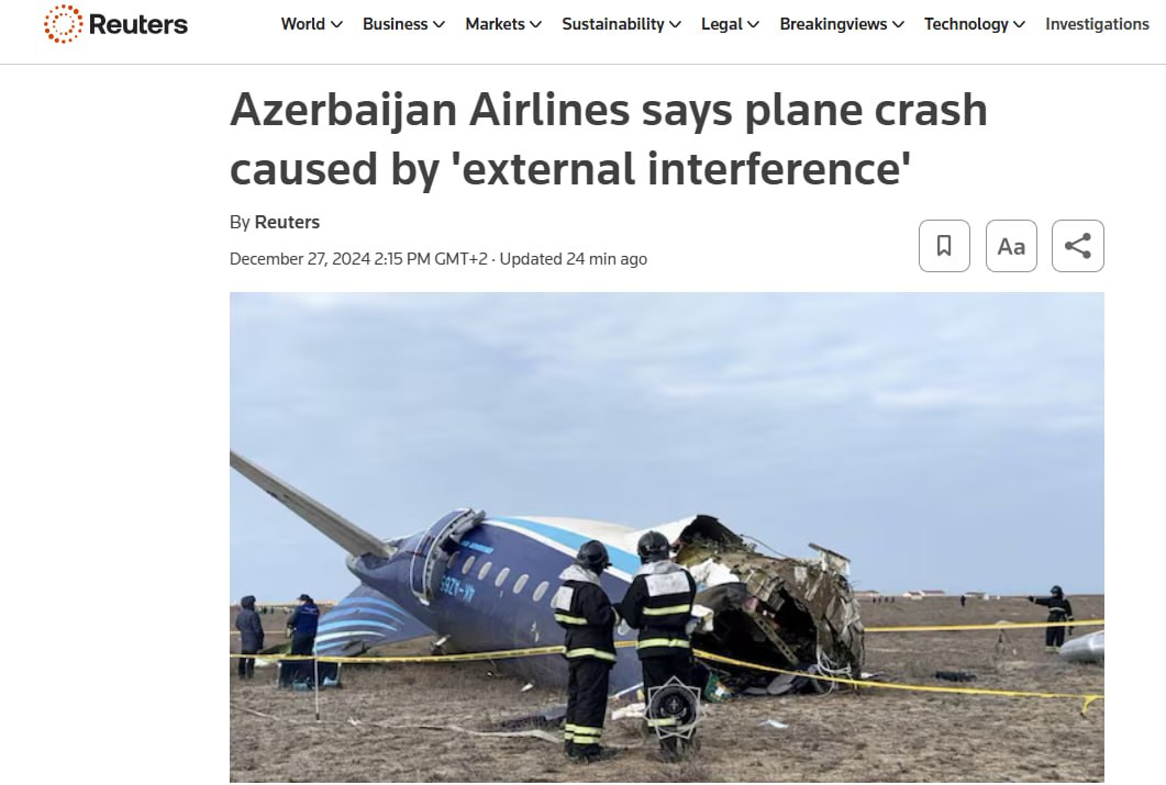Крушение самолета AZAL произошло из-за внешнего вмешательства, — пресс-служба Azerbaijan Airlines