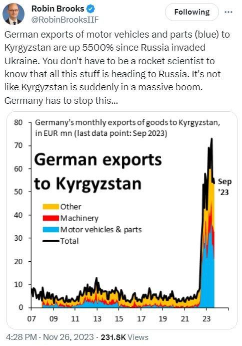 Кажется, на Западе начали о чем-то догадываться 🤔 По словам экономиста, не похоже, что в Кыргызстане внезапно начался автомобильный бум. Скорее всего, все эти машины и запчасти направляются в Россию. Благодаря таможенному союзу, Кыргызстан может продать товары в РФ без дальнейшего контроля и дополнительных сборов.