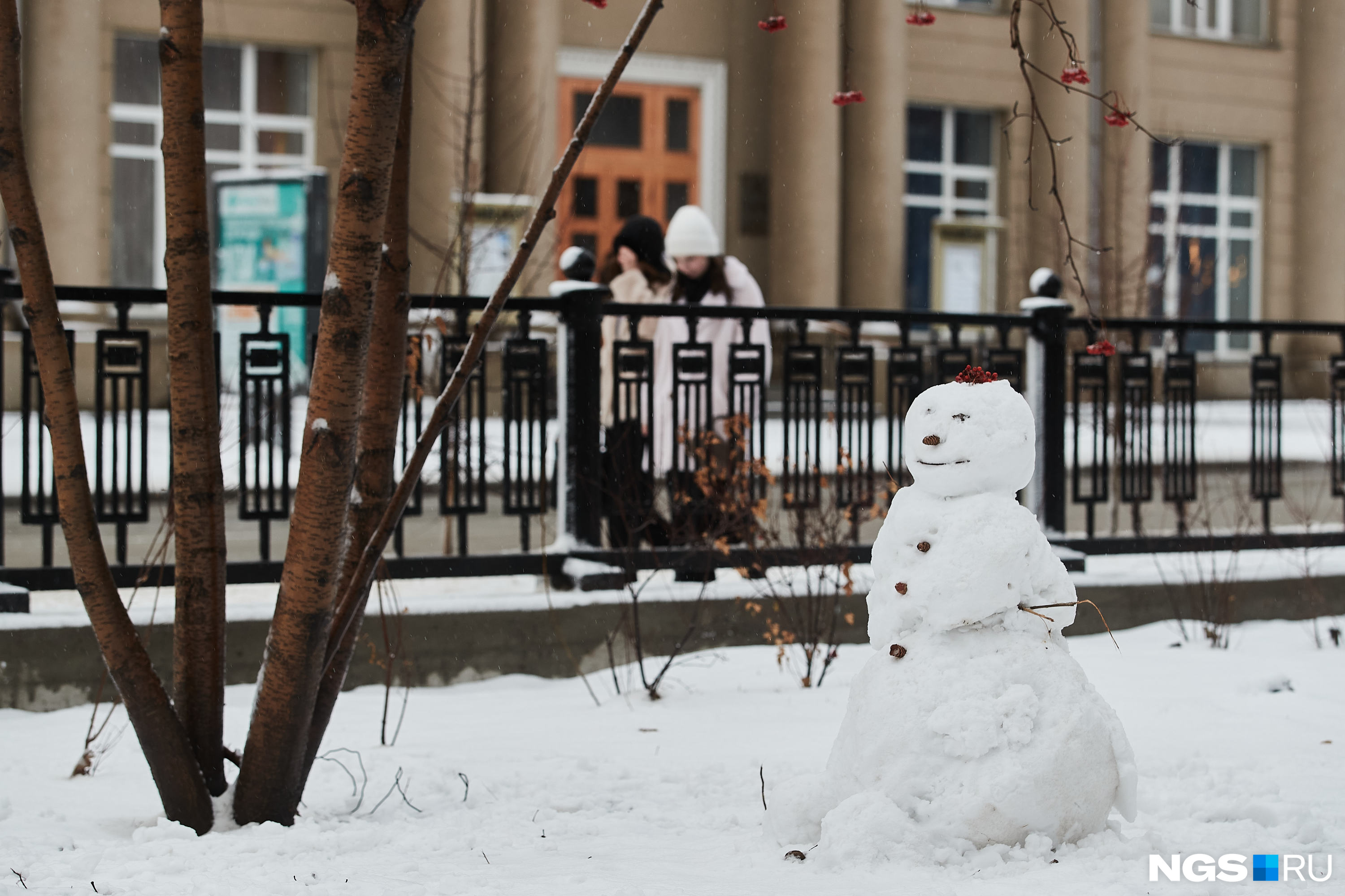 Новосибирцы в теплую погоду начали украшать город к Новому году. Сибиряки решили слепить снежные фигуры