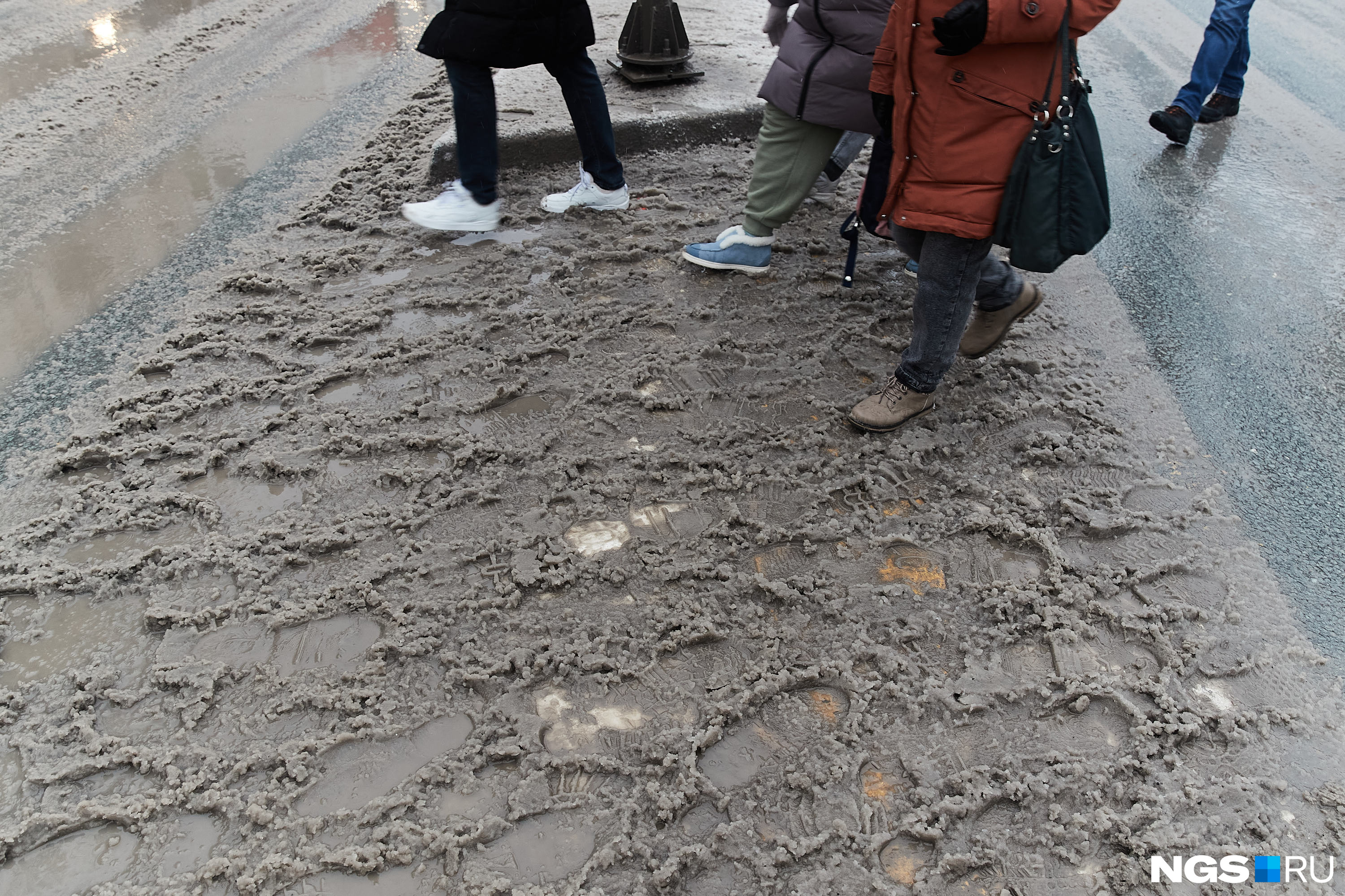 Новосибирцы перешагивают лужи на дорогах