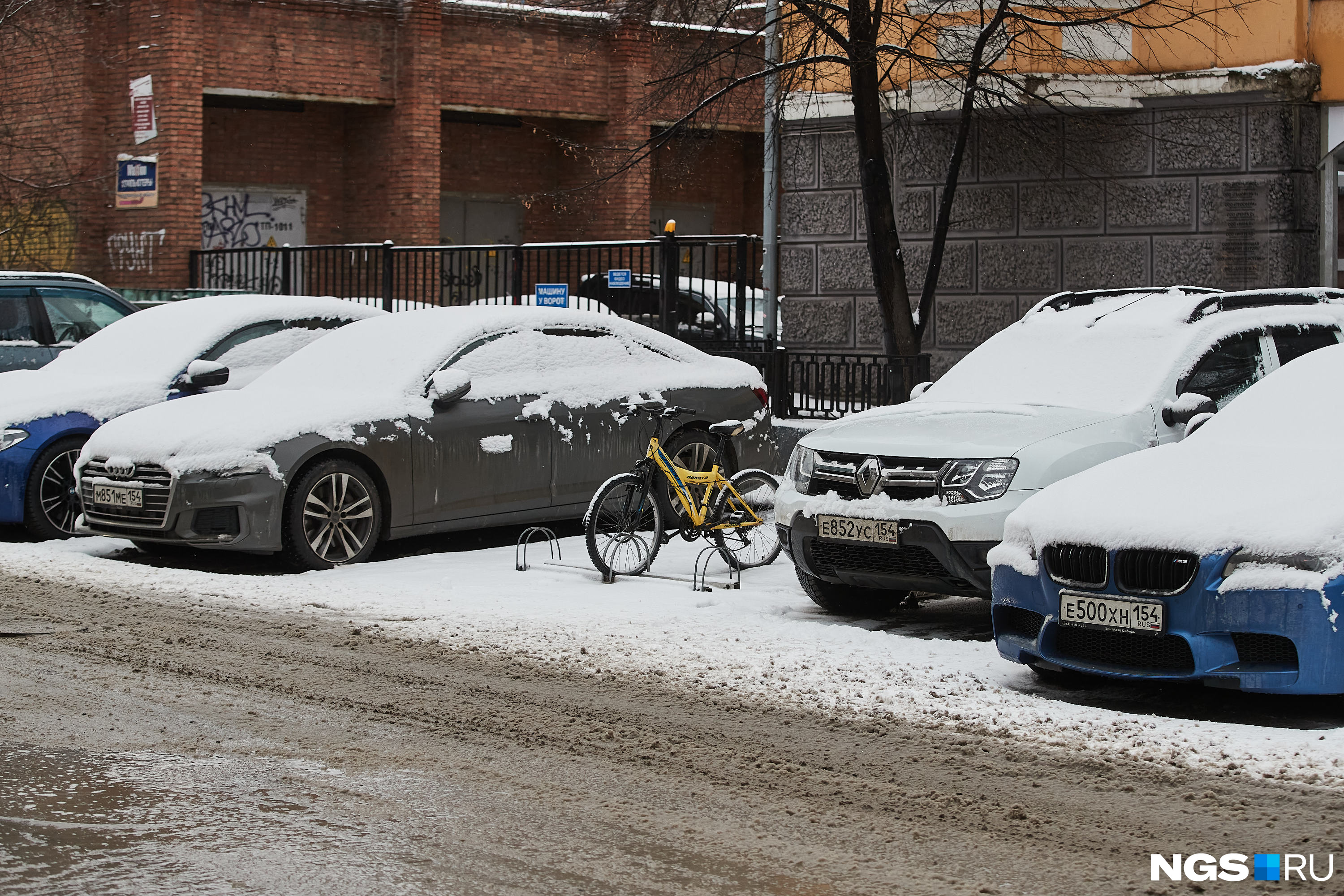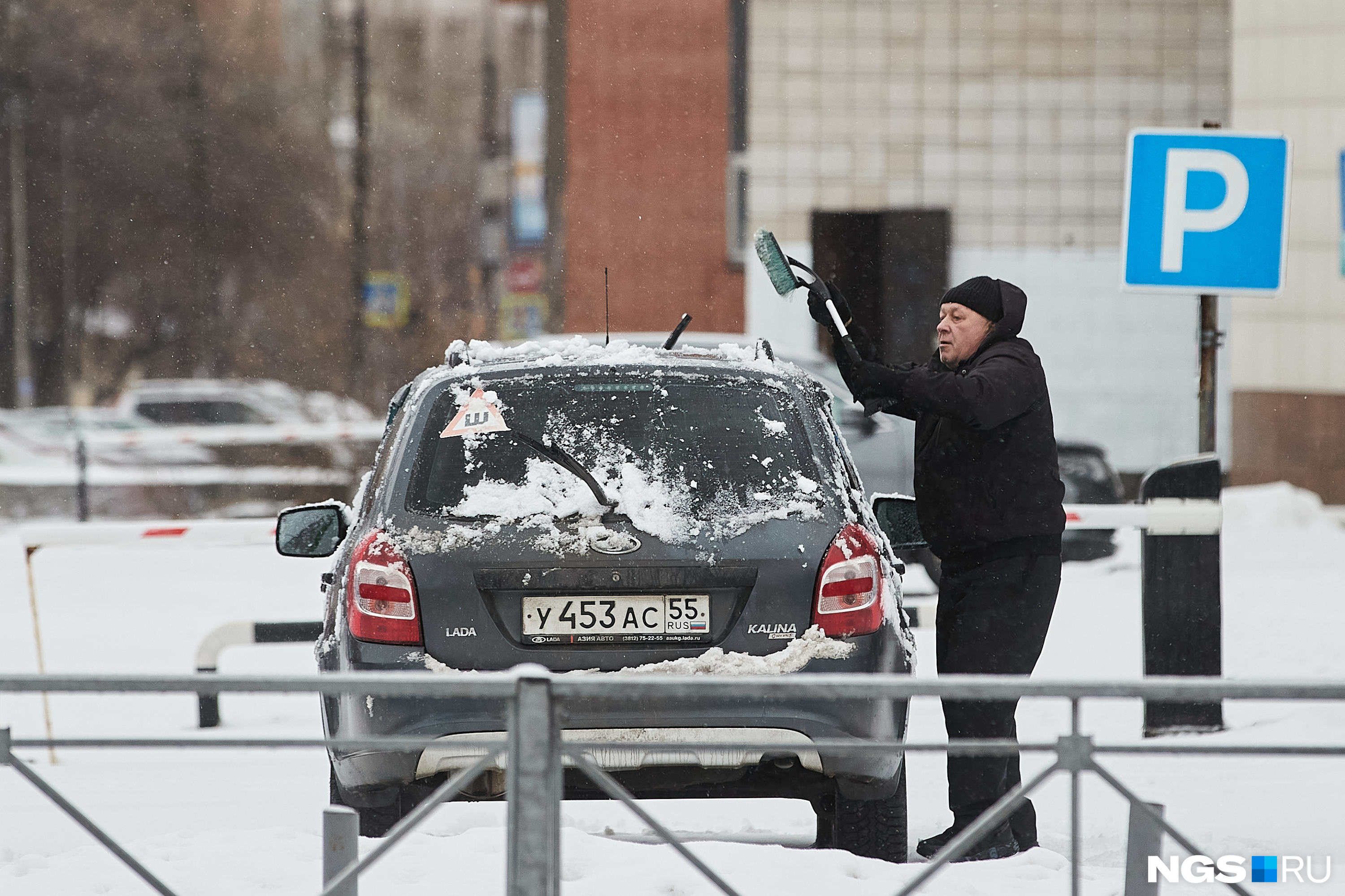 Мокрый снег облепил машины, из-за чего водители чистят транспорт