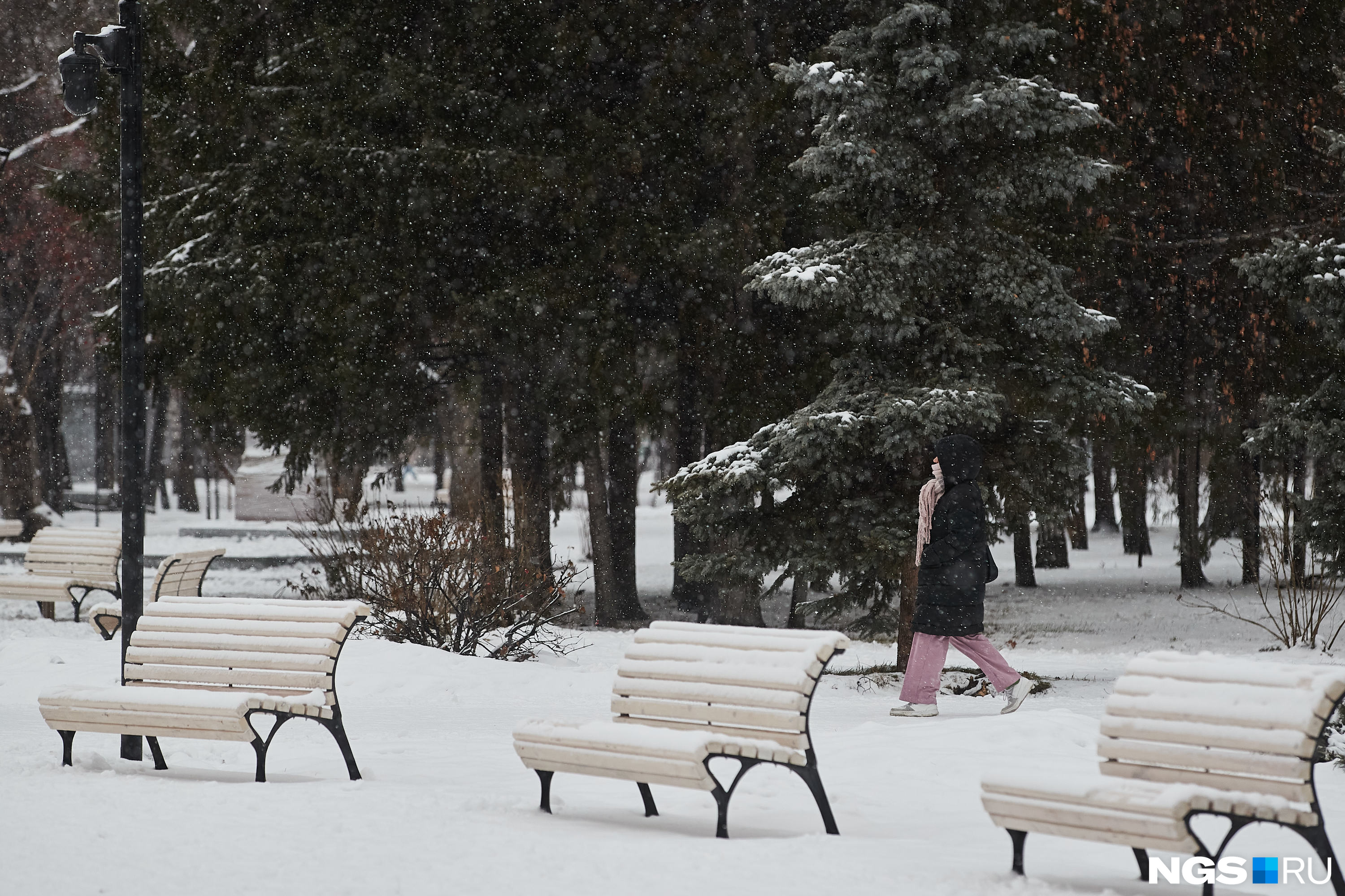 Снежные осадки накрыли пешеходные дорожки и лавочки
