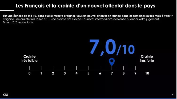 Исследование, проведённое институтом CSA после теракта в «Крокусе» по запросу СМИ показало, что общий уровень страха среди населения Франции составляет 7 баллов из 10.