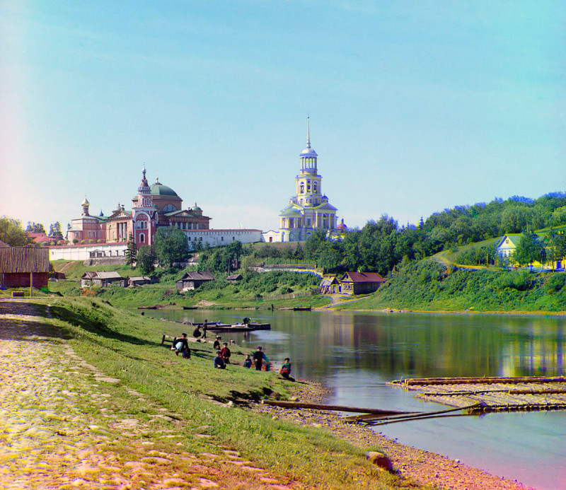 Торжок. Вид на Борисоглебский монастырь от моста. Цветное фото, 1910 г.