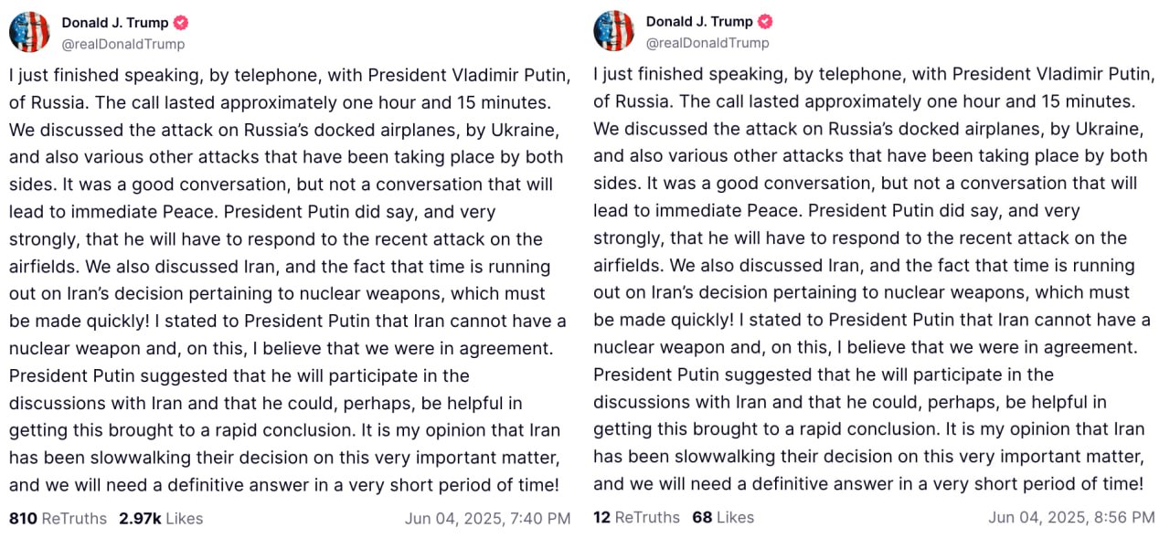 Трамп перезалил свой пост о разговоре с Путиным без изменений текста.