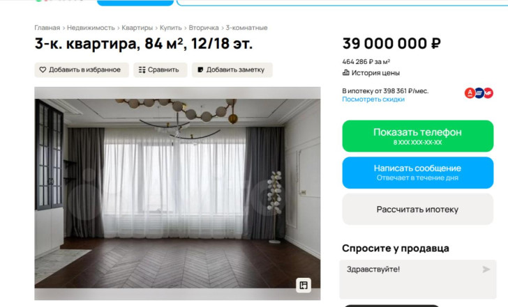 Квартира площадью 84 кв. м находится на 12-м этаже 18-этажного дома 2021 года постройки. В объявлении отмечается, что в жилье выполнен дизайнерский ремонт по индивидуальному проекту из дорогих материалов, при этом в квартире никто не проживал. Высота потолков — 3,3 метра, установлены большие панорамные окна с хорошей инсоляцией и видом на город.