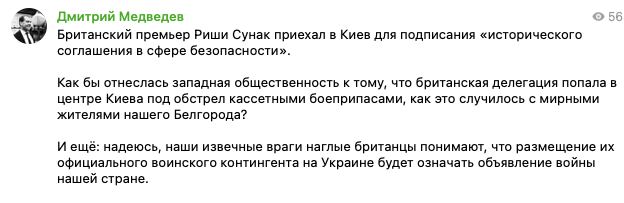❗️Зампред Совета Безопасности России Дмитрий Медведев прокомментировал «историческое соглашение в сфере безопасности» между Киевом и Лондоном: 📝 «Надеюсь, наши извечные враги наглые британцы понимают, что размещение их официального воинского контингента на Украине будет означать объявление войны нашей стране», – написал Медведев.