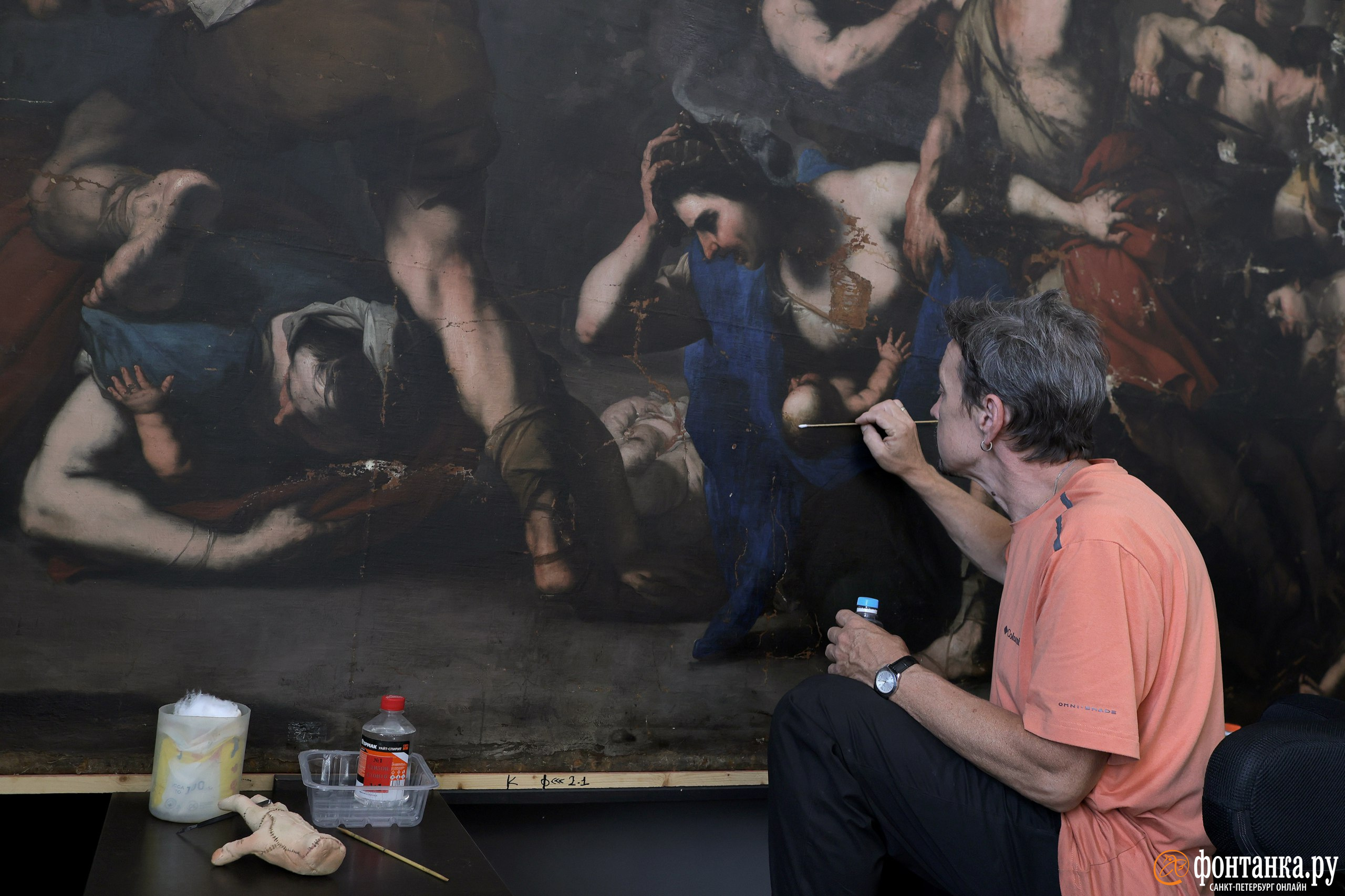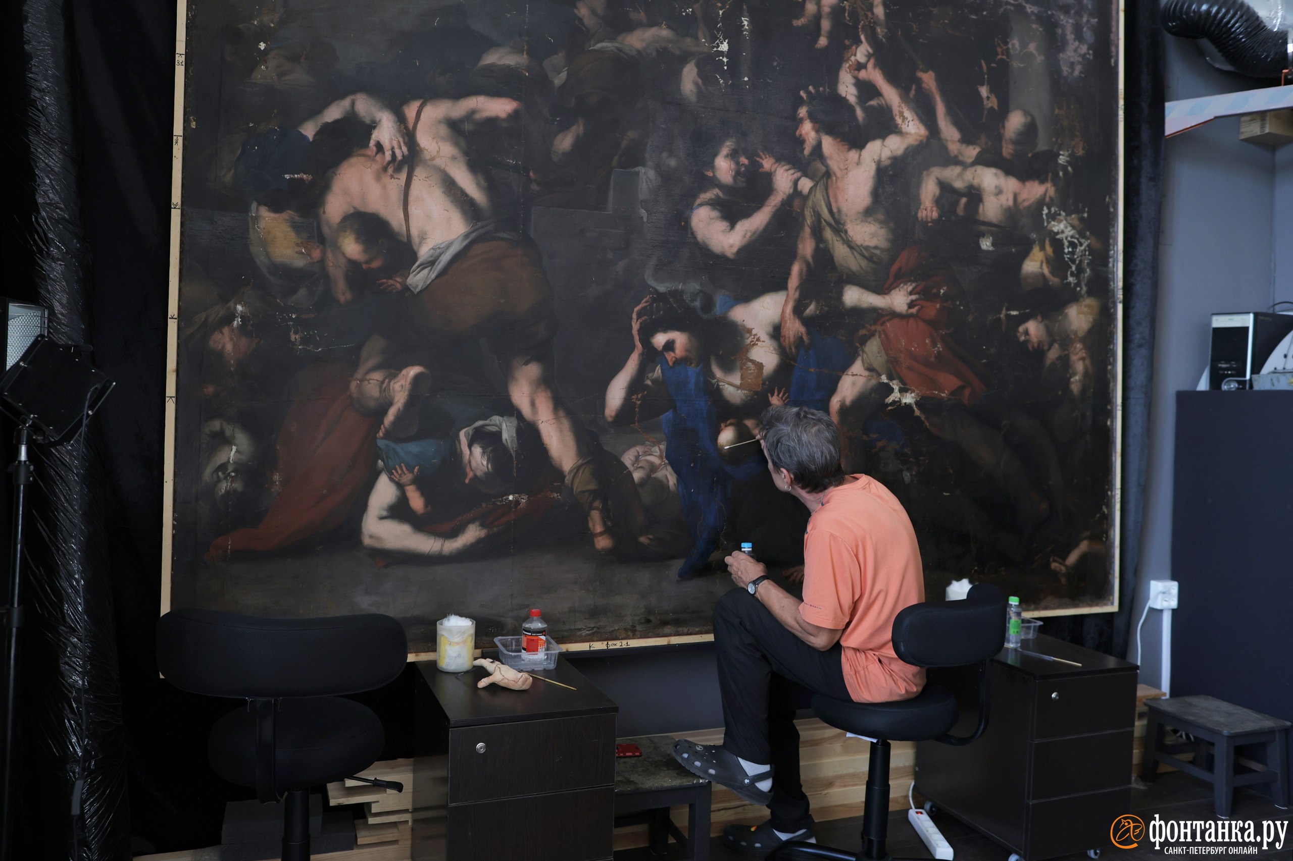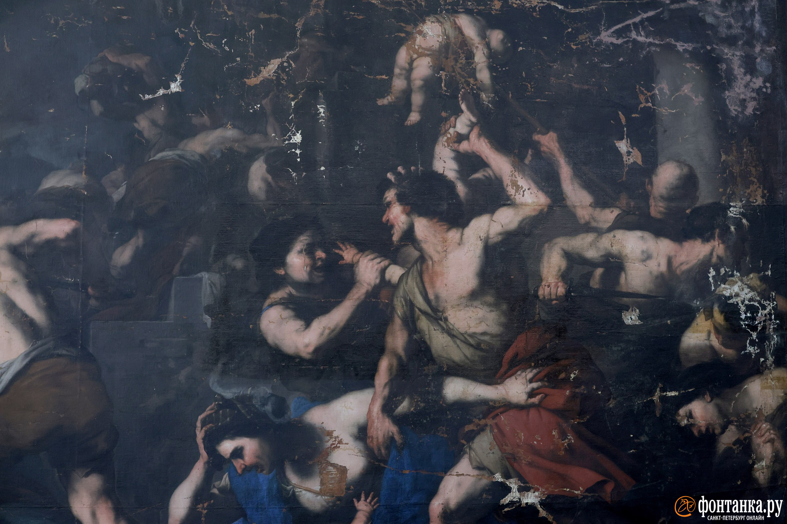 Реставраторы Музея Академии художеств уже полтора года приводят в порядок масштабное полотно неаполитанского мастера эпохи барокко Луки Джордано «Избиение младенцев». Широко известна картина художника на аналогичный сюжет из Музея Прадо в Мадриде, а вещь из Музея Академии почти никто не видел больше ста лет. В 2025 году её покажут на выставке работ Луки Джордано и его учеников, которая пройдёт в ГМИИ им. Пушкина в Москве. «Фонтанка» побывала в реставрационной мастерской, увидела картину до «премьеры» и узнала захватывающую историю полотна.