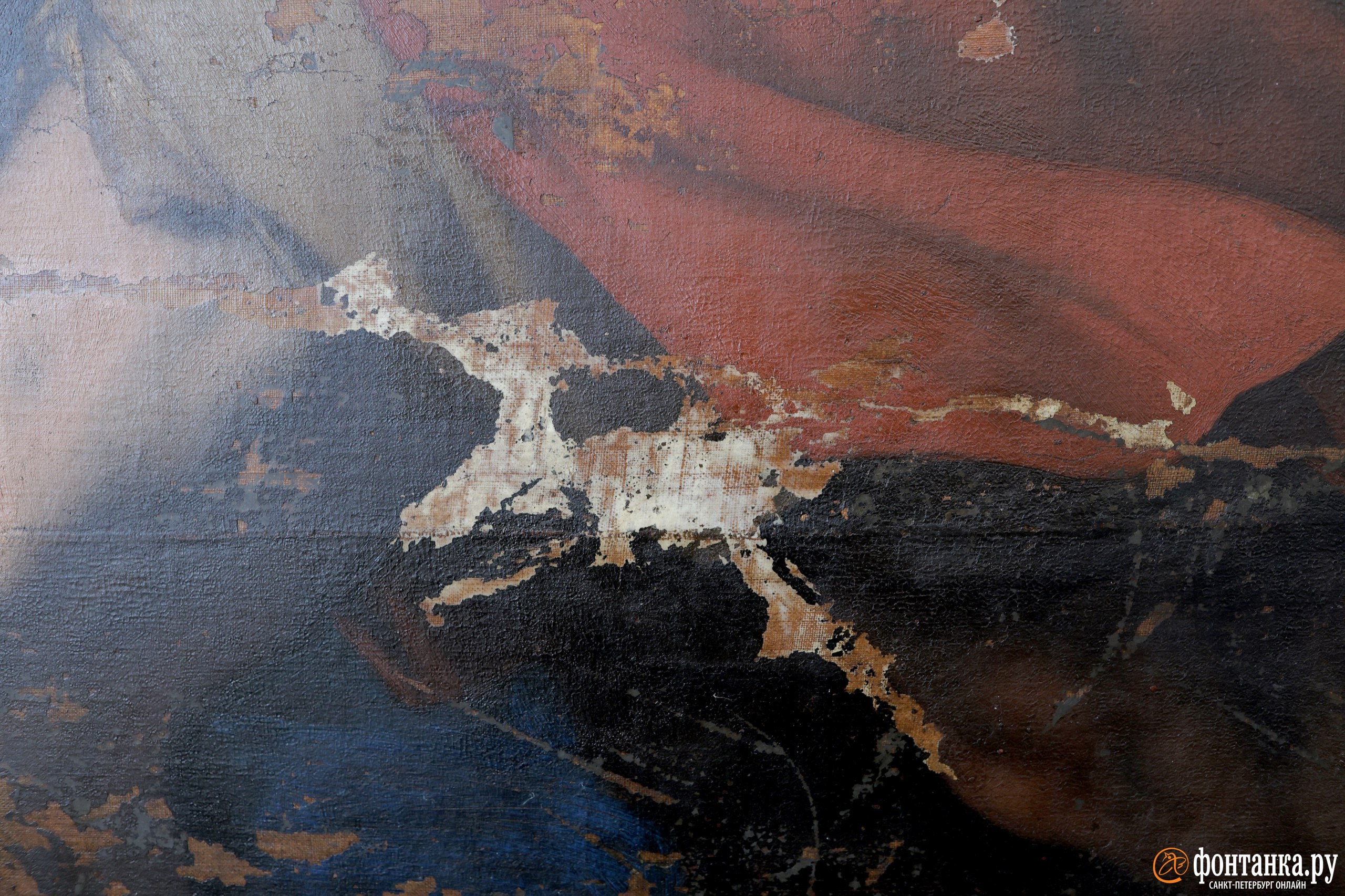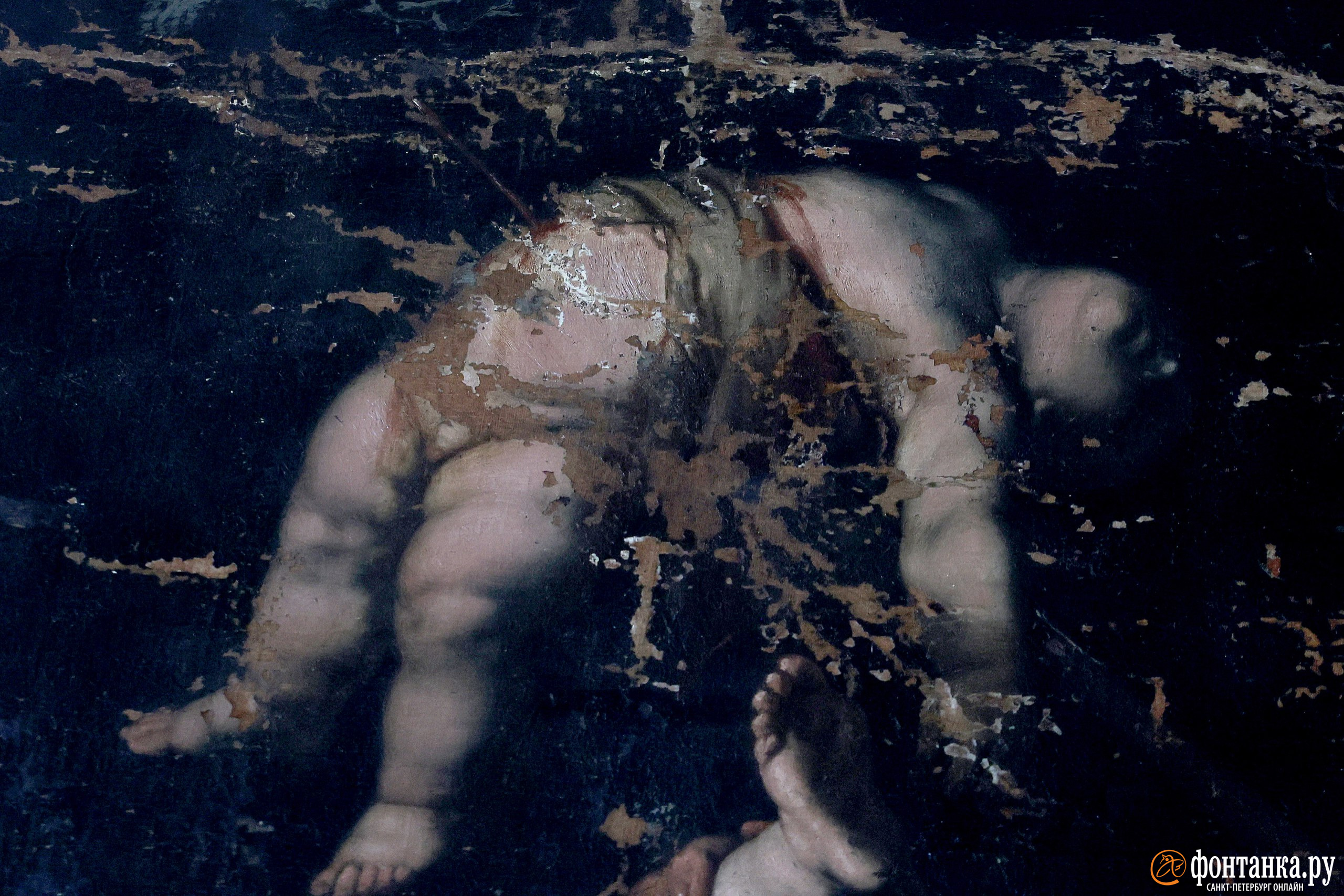 «Скорость работы Луки Джордано нам в целом на руку, потому что получается единый цельный красочный слой, без поздних переписок, которые могут отслаиваться, — продолжает Ольга. — Хотя иногда такая манера мастера всё же вредит. Например, в нашей картине художник не везде ровно положил грунт: в нижней правой части картины есть участок, где явно видно небрежность, неровность».
