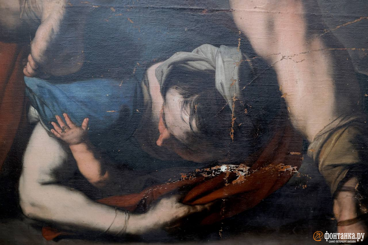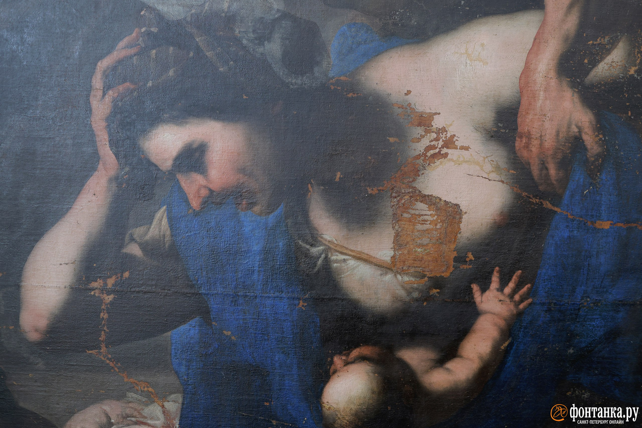 «Эрмитаж передал сначала копии работ, которые у них хранились и никак не были связаны с Музеем Академии, — продолжает хранитель. — Затем начали передавать оригиналы, но опять же не те, которые они получили из Академии. В их числе была и эта картина, у которой очень богатая история. При расчистке профилактических заклеек реставраторы нашли на поверхности инвентарный номер, который означал, что некогда картина находилась в коллекции графа Генриха фон Брюля (1700 — 1763), который был первым министром короля Польши и курфюрста Саксонии Августа III. Это был могущественный человек, он собрал богатую художественную коллекцию, которую после его смерти целиком купила Екатерина II. В 1769 году коллекция фон Брюля приехала в Петербург, но так как Эрмитаж продолжал пополняться, то часть работ, оставаясь в составе эрмитажной коллекции, служили в том числе украшением интерьеров в пригородных императорских дворцах. Поэтому «Избиение младенцев» Луки Джордано перед революцией 1917 года находилось в Гатчинском дворце. Видимо, в годы революции и Гражданской войны её сняли и накатали на вал».