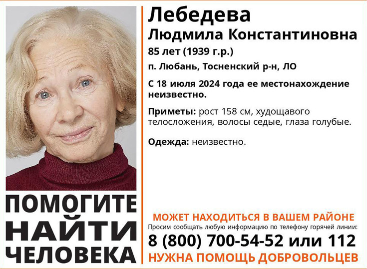В поисковой ориентировке указан поселок Любань Тосненского района Ленобласти.