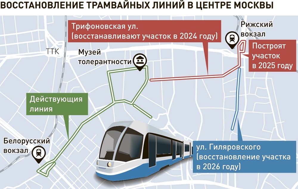 Как ожидается, работа по обновлению инфраструктуры на этом участке завершится до конца года. На втором этапе, который намечен на 2025 год, начнут прокладывать новый отрезок пути по улице Гиляровского с разворотным кольцом у Рижского вокзала. В том же году намечено открыть движение по Трифоновской улице. Курсировать будут современные низкопольные трамваи.