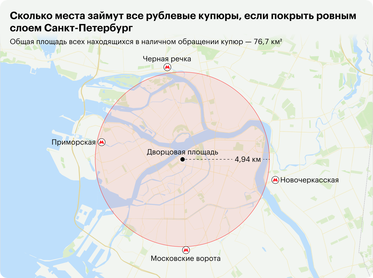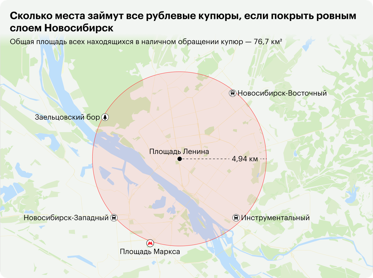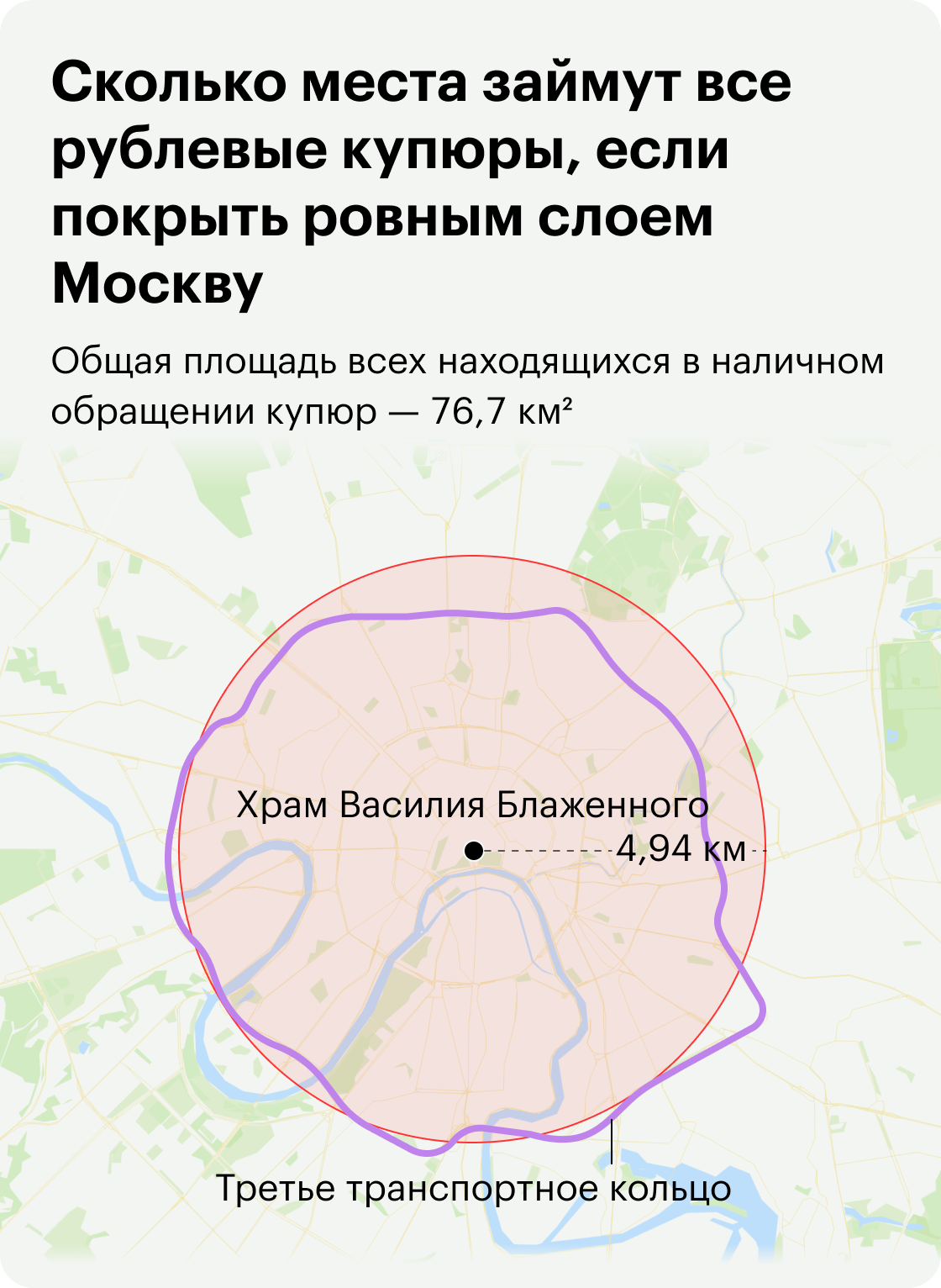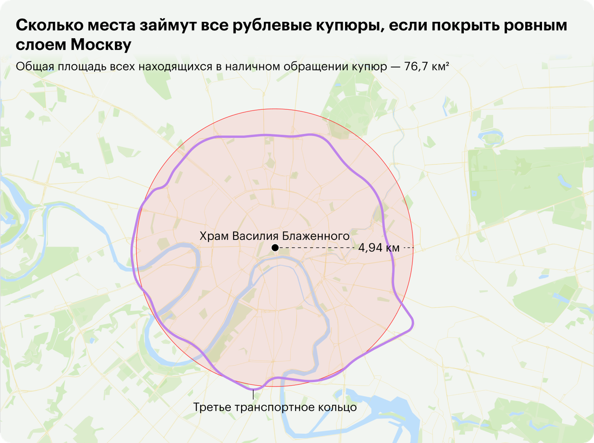 Общая площадь всех находящихся в наличном обращении купюр — 76,7 км², этими деньгами можно покрыть ровным слоем центр Москвы. А если сложить в куб — получится сооружение со стороной 21,2 м. Статистика по количеству купюр каждого номинала тоже находится в открытом доступе.