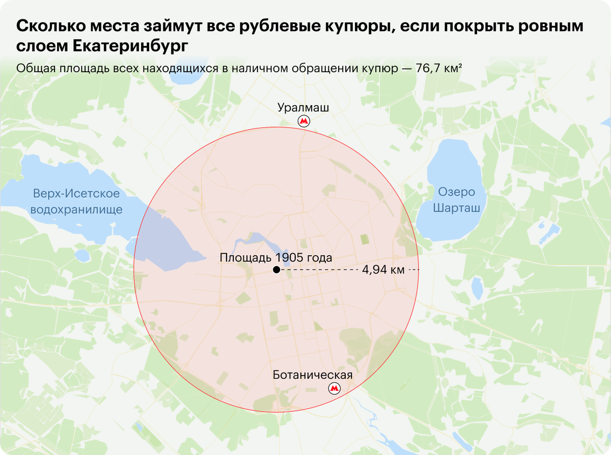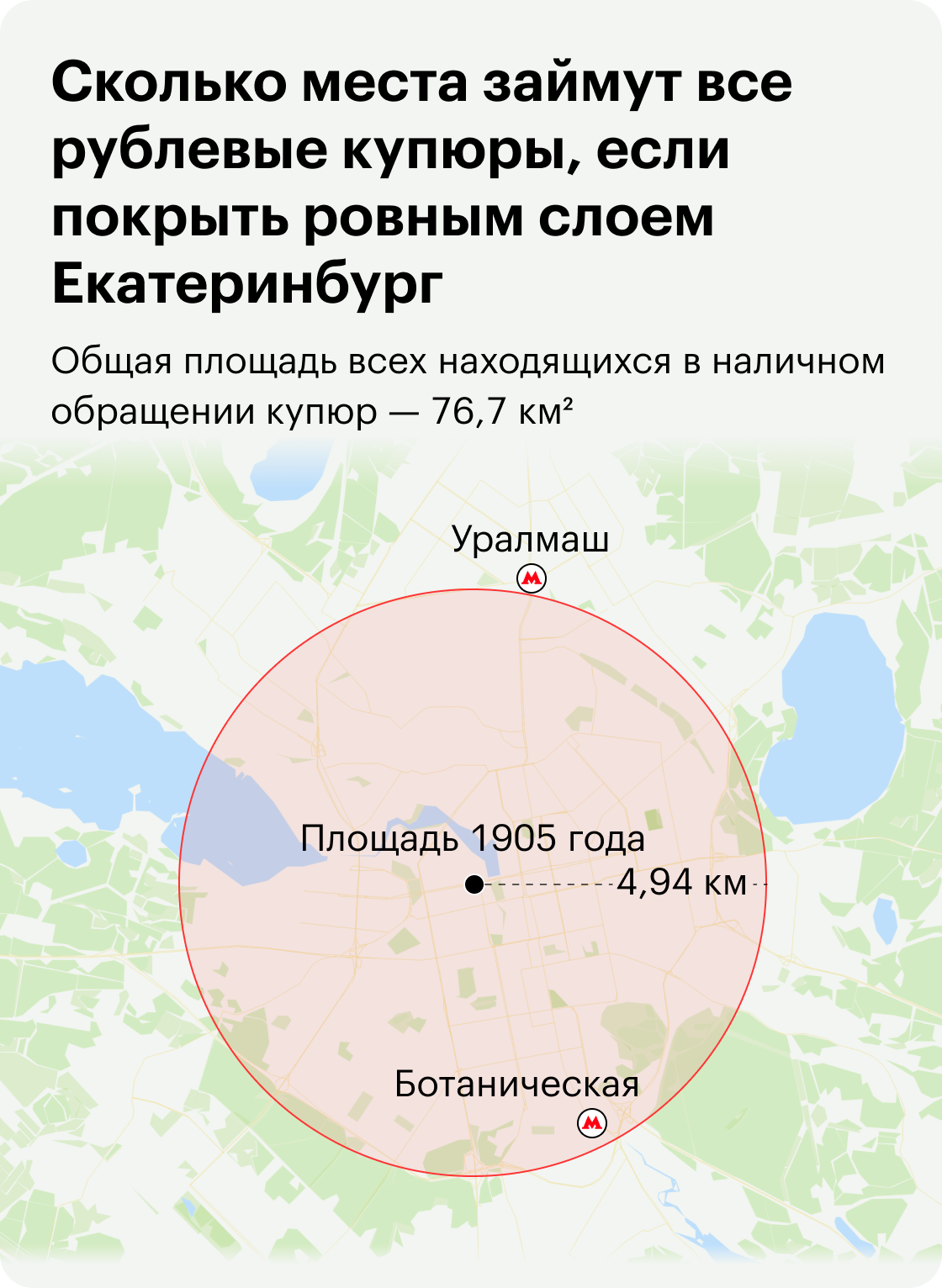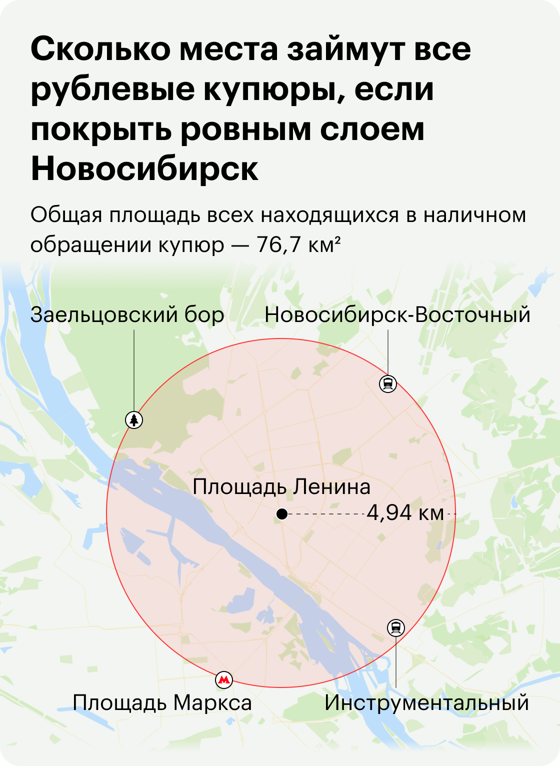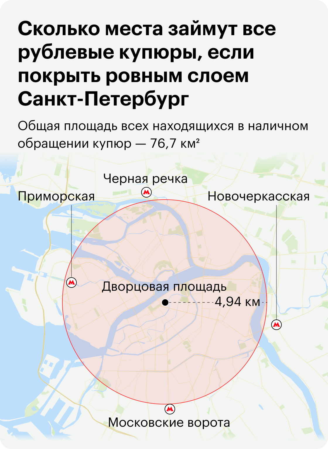 Общая площадь всех находящихся в наличном обращении купюр — 76,7 км², этими деньгами можно покрыть ровным слоем центр Москвы. А если сложить в куб — получится сооружение со стороной 21,2 м. Статистика по количеству купюр каждого номинала тоже находится в открытом доступе.