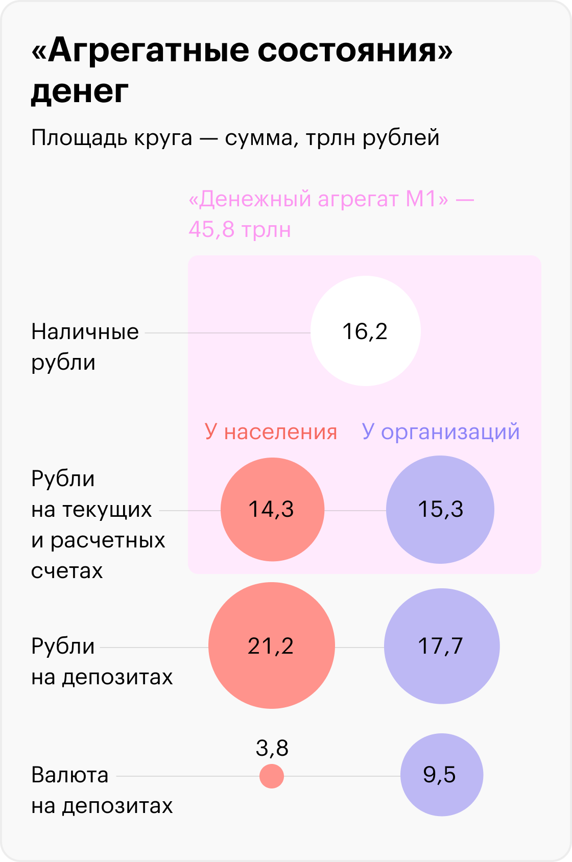 Разные агрегаты нужны, чтобы понимать, сколько денег в принципе доступно в экономике: например, наличные можно потратить в любой момент, лишь бы были покупатель и продавец. Деньги с текущих счетов — в общем тоже, но только при участии банков.