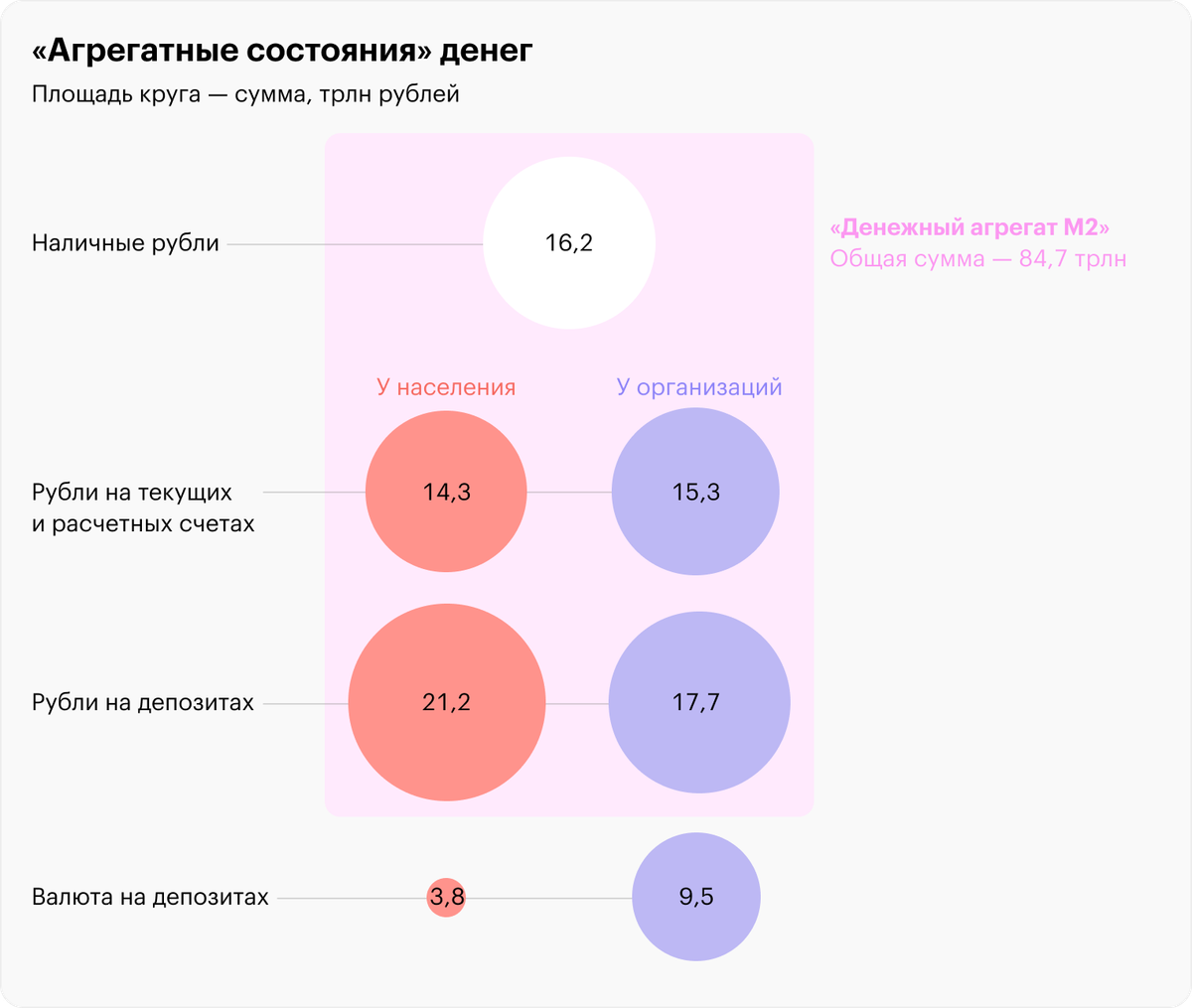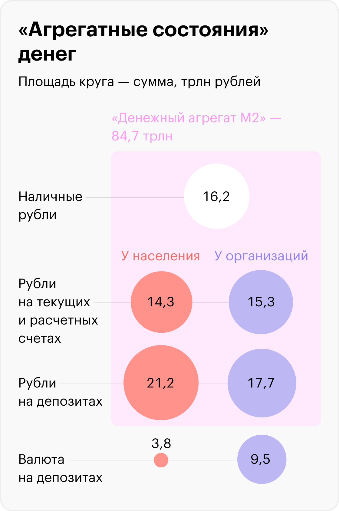 Агрегат М2, или, как его еще называют, «денежная масса в национальном определении», — это все легкодоступные наличные и безналичные рубли, которые есть в экономике России, — около 84,6 трлн. Обычно экономисты следят за денежной массой именно по этому показателю. Для сравнения: расходы государственных бюджетов всех уровней за прошлый год составили 55,2 трлн, ВВП — 153,4 трлн, а выручка всех российских организаций — 274,2 трлн.