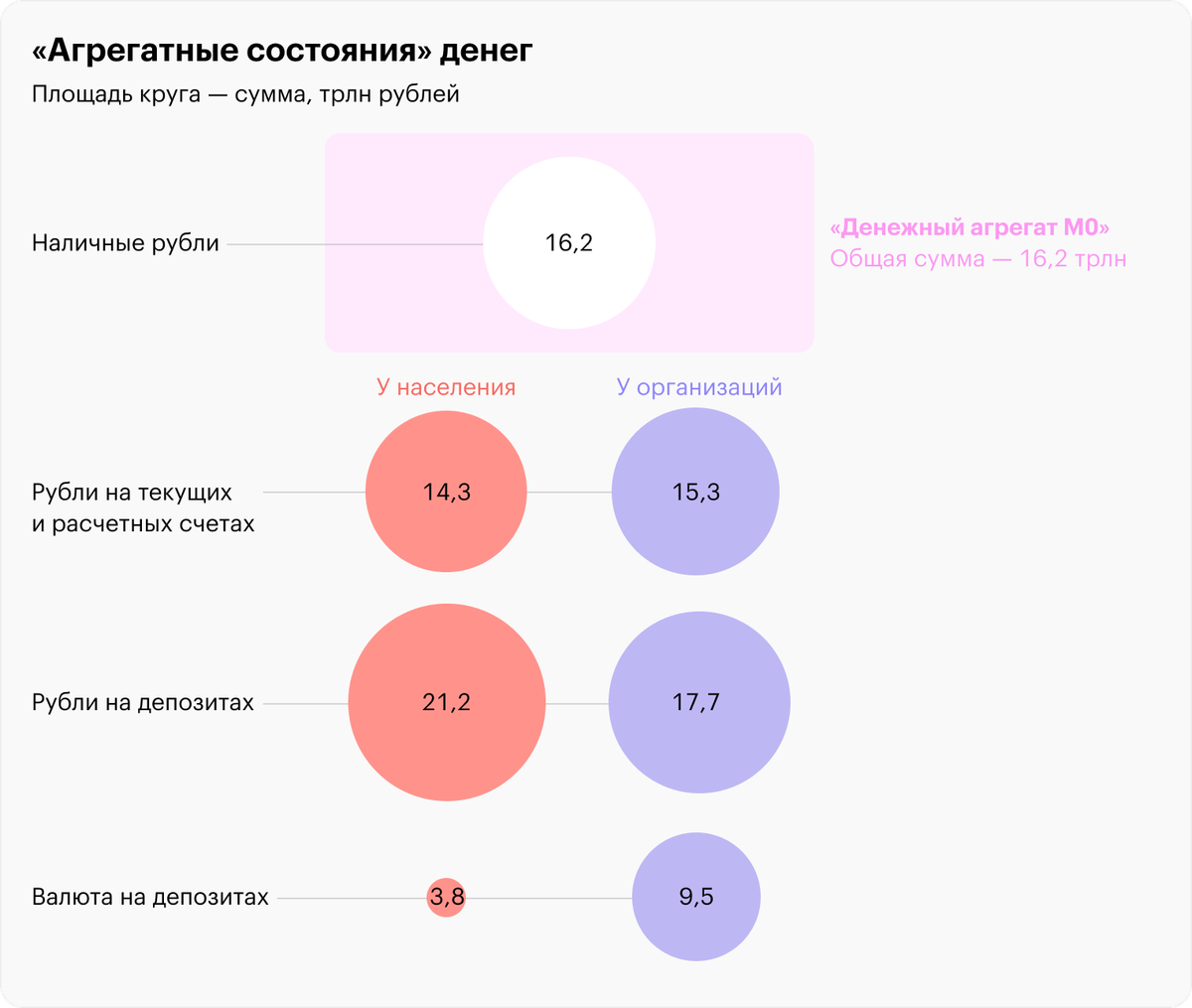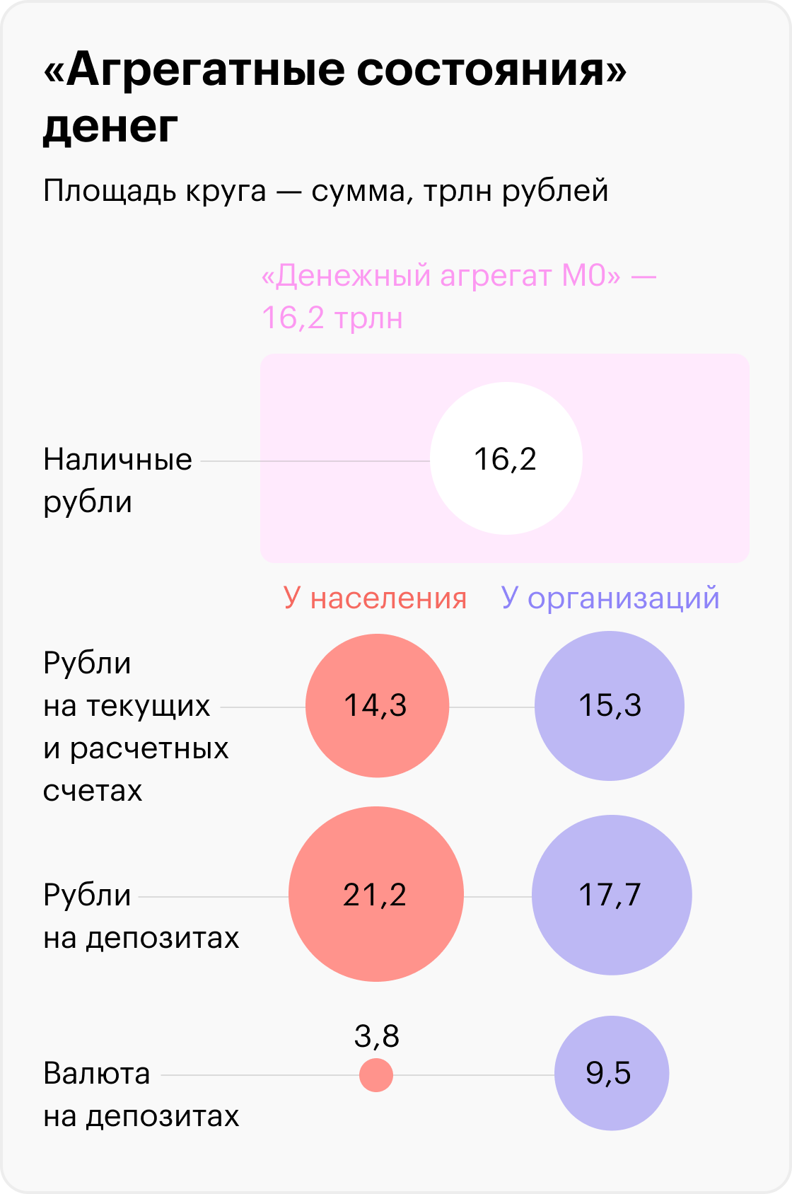 Если посчитать только наличные деньги, то на языке Центробанка этот показатель будет называться «денежный агрегат М0». Если к наличным добавить все рубли с текущих и расчетных счетов — получится «денежный агрегат М1». Если прибавить к этому еще и рублевые депозиты — «агрегат М2».